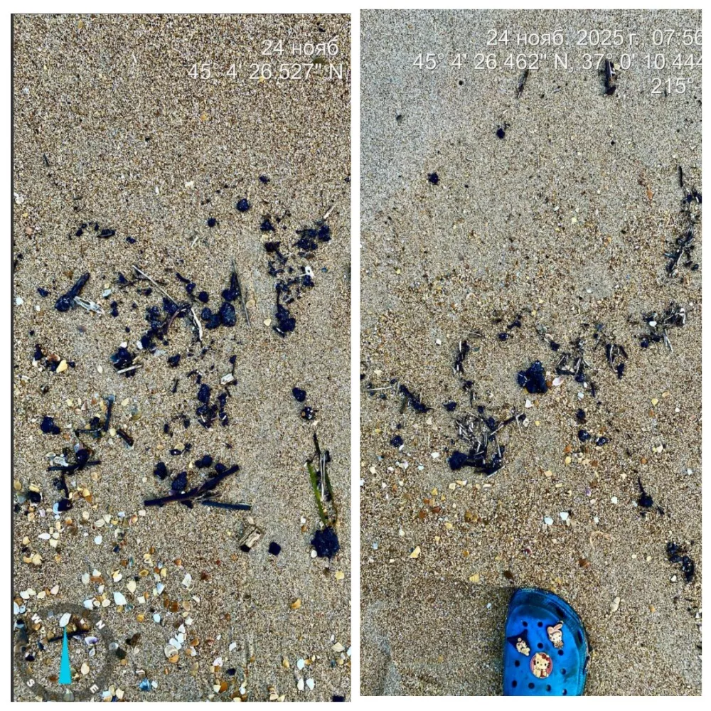 Утром 24 ноября мазут вновь зафиксировали на очищенных участках пляжей. По словам волонтеров, несколько дней назад они находили единичные фракции, а сейчас это «скопление» нефтепродуктов.