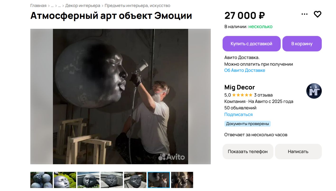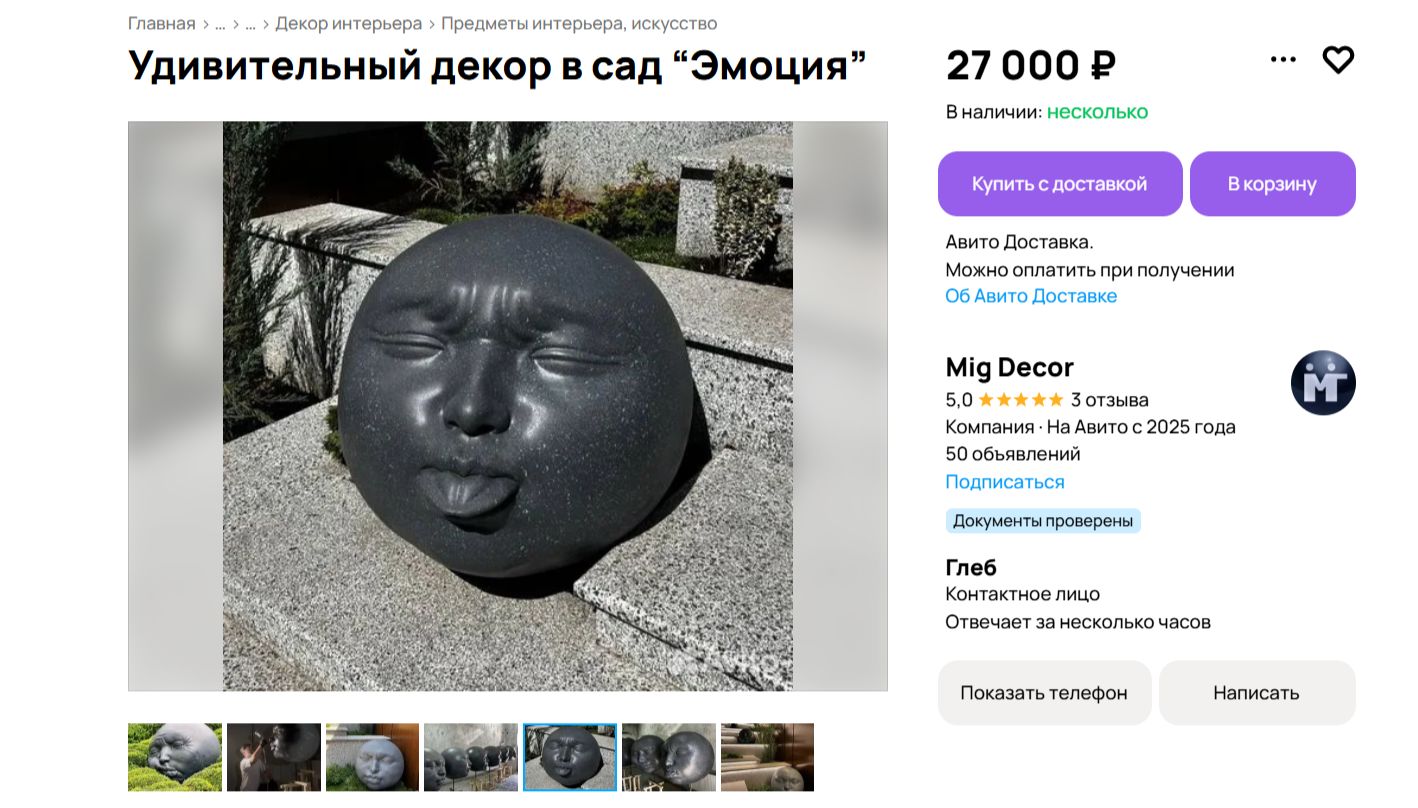 Продавец пишет, что диаметр скульптур — 80 см. Покупатель может выбрать одну из пяти эмоций, которые будет выражать голова. Также можно выбрать любой цвет и фактуру. Стоимость одной скульптуры — от 26 999 рублей.