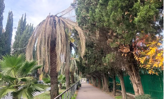 10 декабря издание «Сочи Онлайн» сообщило, что в Адлере на улице Ленина погибла пальмовая аллея, с которой фотографировались многие туристы — деревья «повесили» листья.