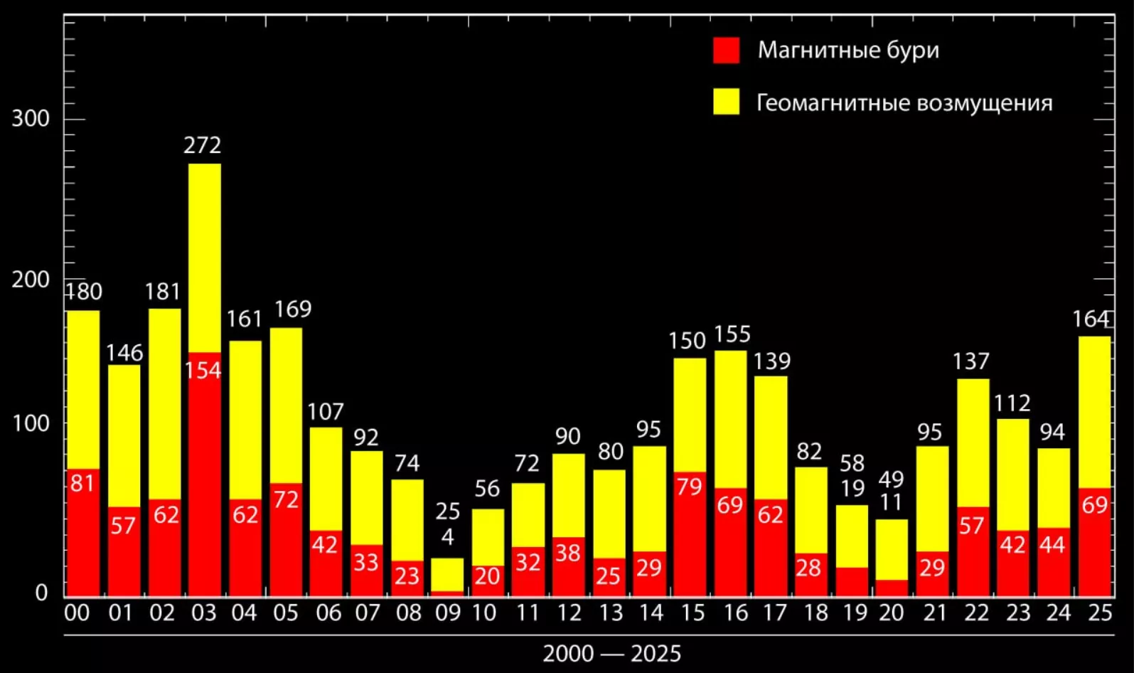Что касается общего числа возмущенных дней, то более высокий показатель (169) зафиксировали 20 лет назад — в 2005 году.