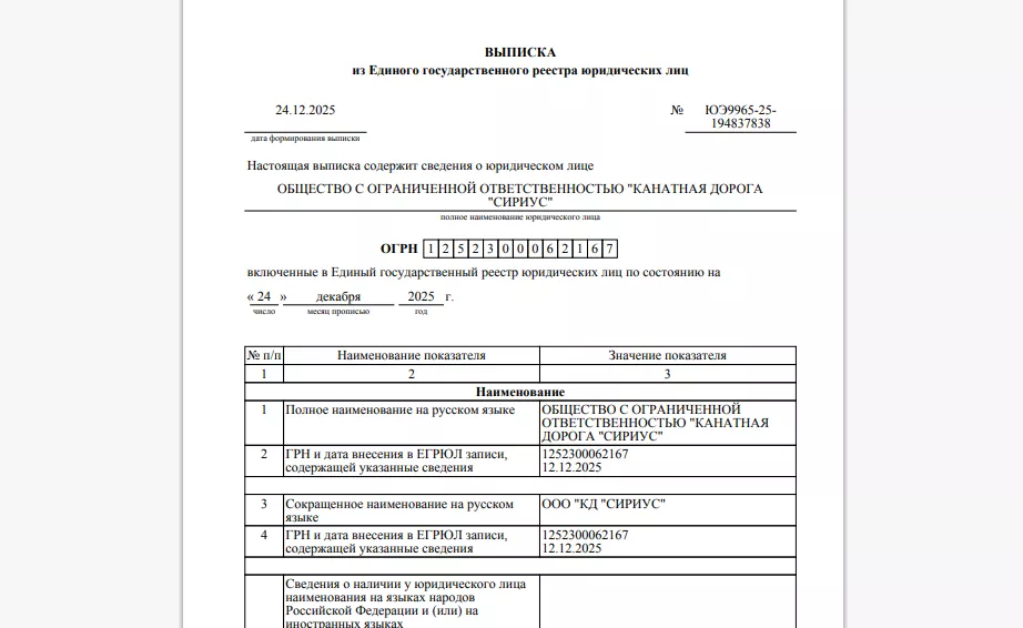 На сайте федеральной налоговой службы России Юга.ру нашли документ о создании юридического лица. В нем указано 92 вида деятельности, которые сможет осуществлять компания. Основным является перевозка пассажиров фуникулерами, подвесными канатными дорогами и подъемниками, являющимися частью городской или пригородной транспортной системы.