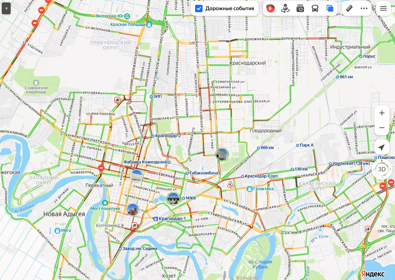 Самые проблемные участки, традиционно, в районе парка «Краснодар» — в обе стороны стоят улицы Школьная, Ялтинская, Передовая, Новороссийская, Восточно-Кругликовская и Северный мост.