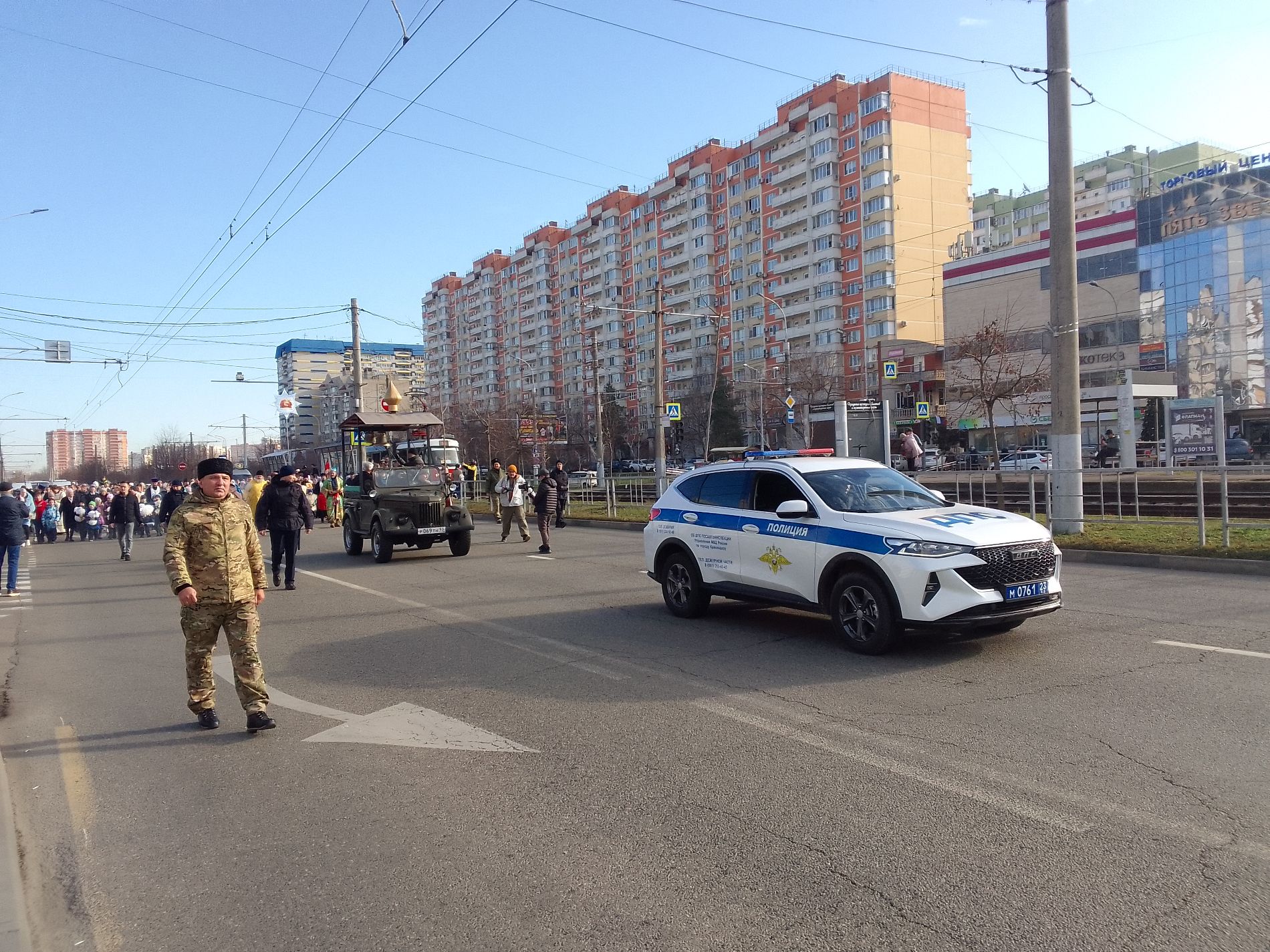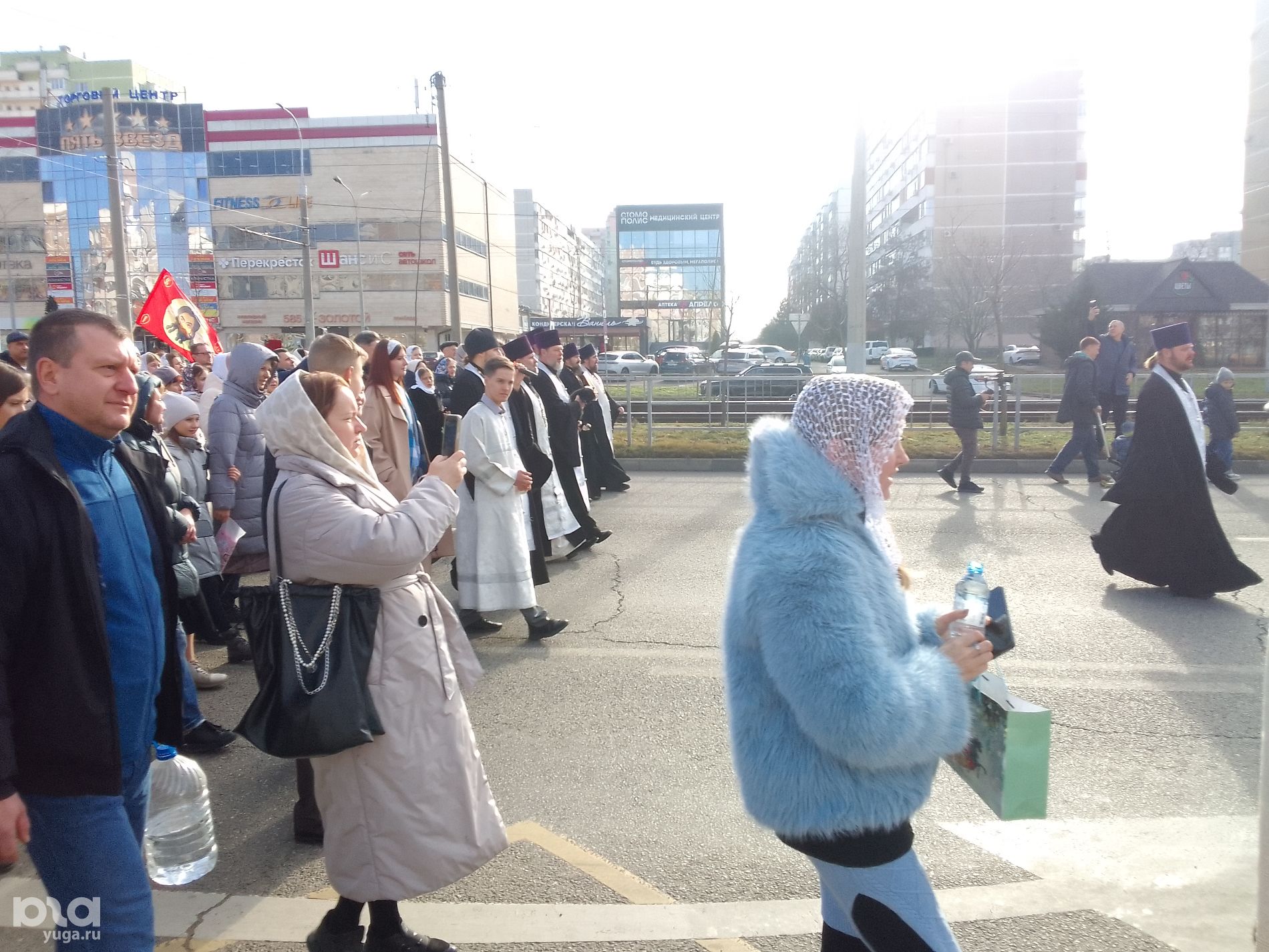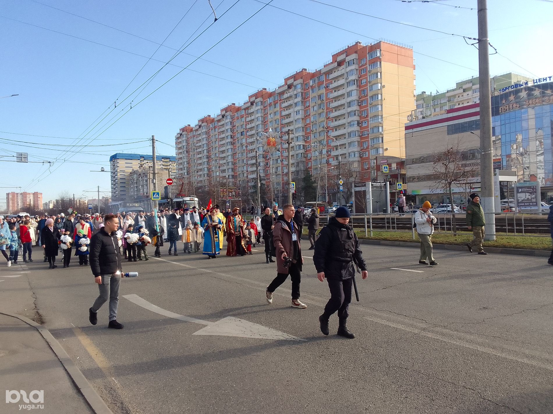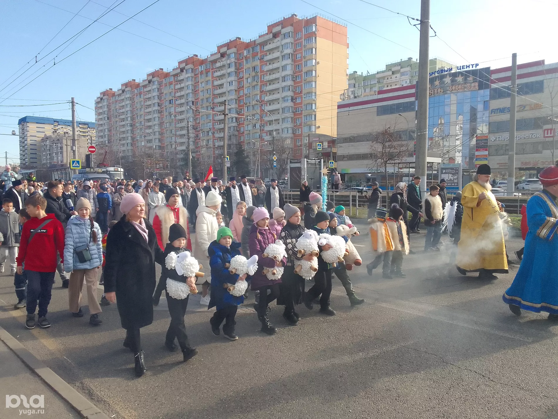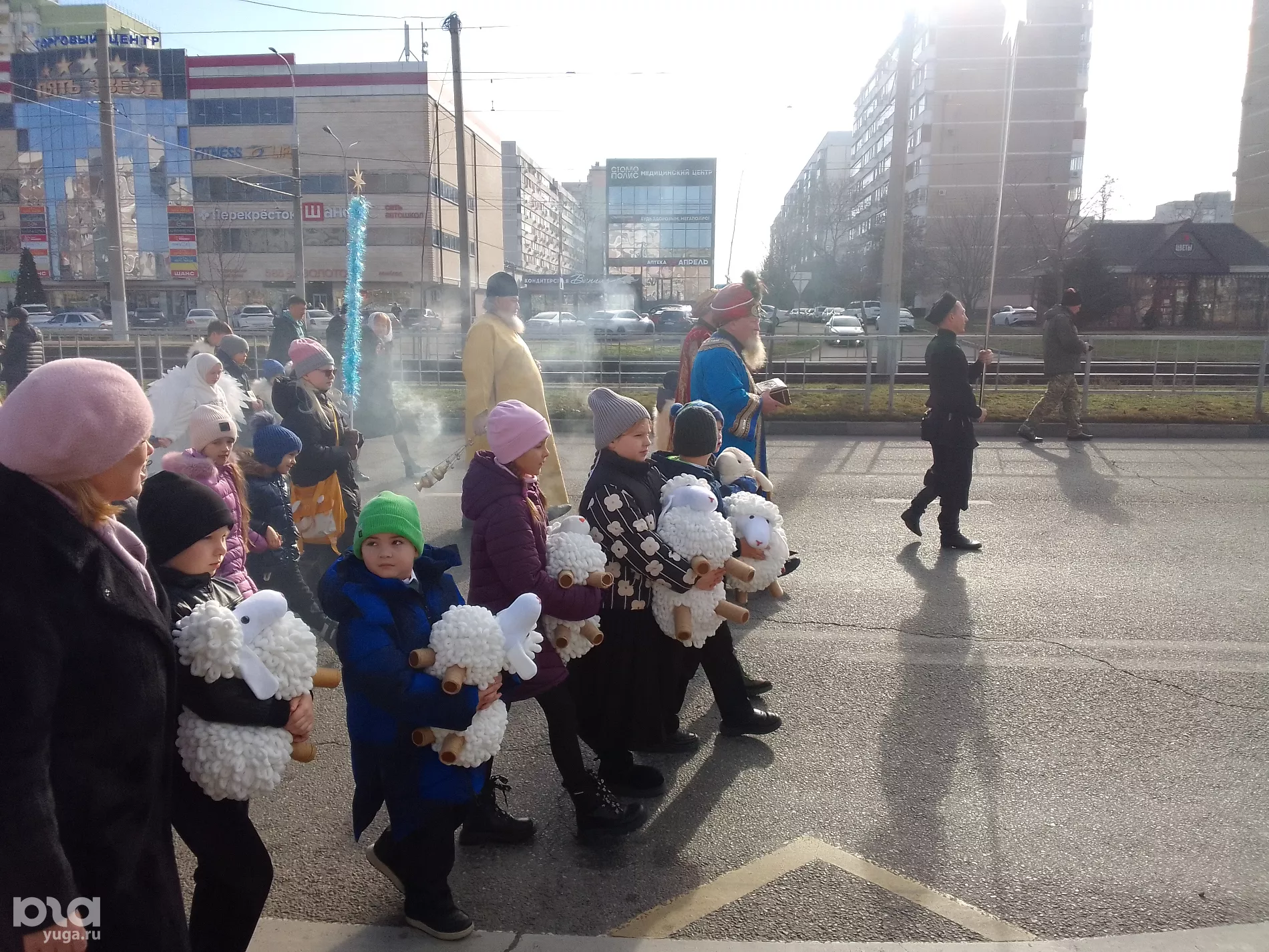 7 января читательница Юга.ру рассказала, что мероприятие в Юбилейном микрорайоне посетили 200 человек и поделилась фото. На кадрах видно небольшую группу людей, проходящих по проспекту Чекистов. Впереди идут служители церкви, а за ними — дети, несущие в руках игрушечных овечек. Крестный ход сопровождали сотрудники полиции.