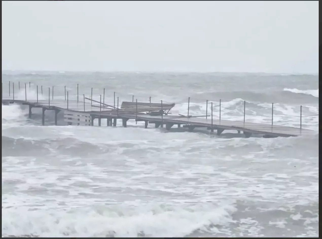 По данным новостного портала «Город», на центральном пляже Анапы волны начали смывать защитный вал, который возводили для сдерживания возможных выбросов мазута. Под угрозой разрушения оказались и пляжные конструкции. Жители рассказали, что стихия уже начала ломать пирс.