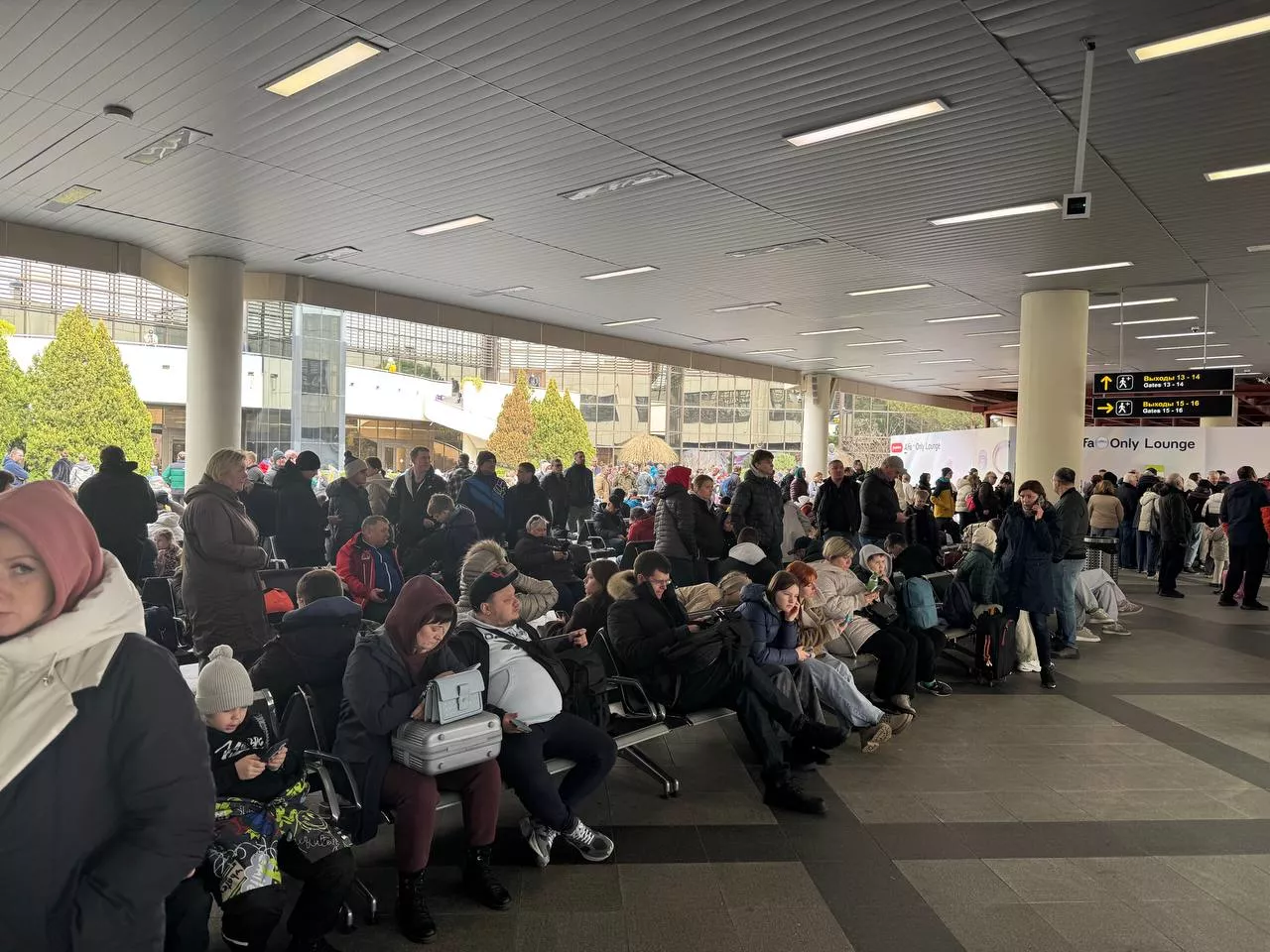В 8:00 24 февраля полеты возобновили, но в 10:00 небо снова закрыли, а в 12:00 аэропорт заработал. Пассажиры ждут рейсы больше суток.