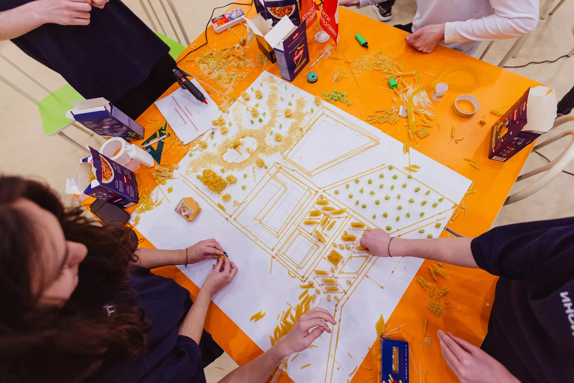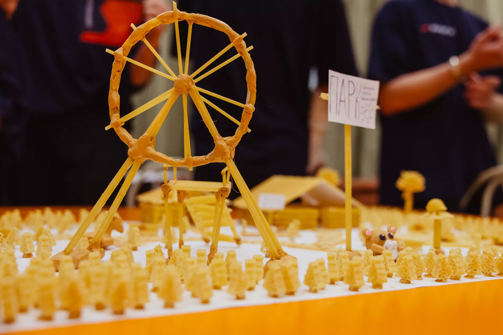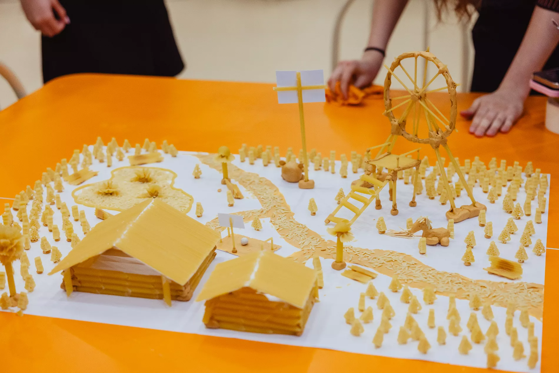 Школьникам предстояло проявить инженерные и конструкторские навыки, и для этого они использовали самые неожиданные материалы — обычные макароны разных форм и строительный пластилин. Их задача — создать макет микрорайона с жилыми домами, детским садом, школой, парком и другими объектами городской инфраструктуры.