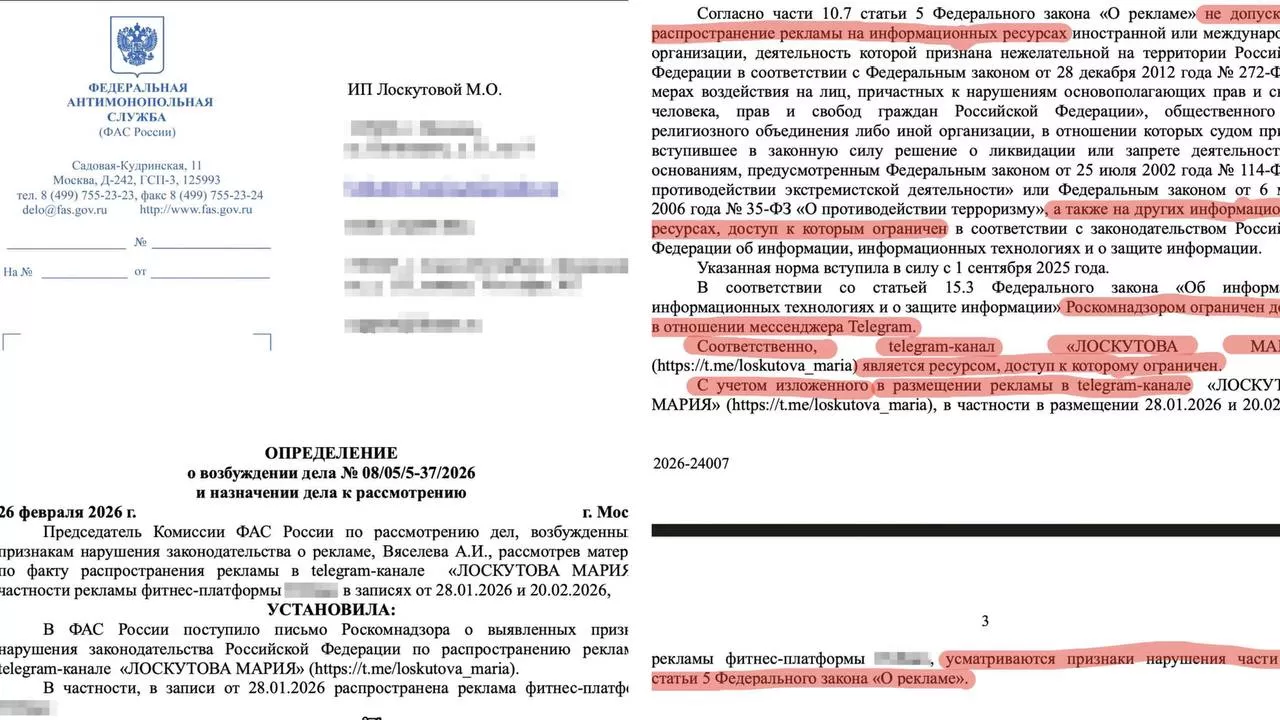 «В соответствии со статьей 15.3 Федерального закона «Об информации, информационных технологиях и о защите информации» Роскомнадзором ограничен доступ в отношении мессенджера Telegram. Соответственно, телеграм-канал «Лоскутова Мария» является ресурсом, доступ к которому ограничен. С учетом изложенного в размещении рекламы в телеграм-канале, в частности в размещении 28.01.2026 и 20.02.2026, усматриваются признаки нарушения части 10.7 статьи 5 Федерального закона «О рекламе», — заявили в документе.