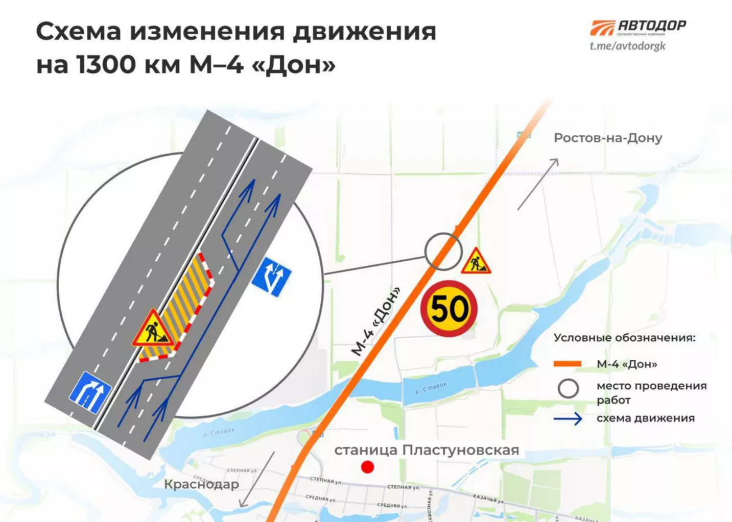 Временные неудобства затронут 1300-й километр автомагистрали в районе станицы Пластуновской. Речь идет о перекрытии одной полосы движения в направлении Ростова-на-Дону, которое продлится вплоть до 15 апреля. Актуальная схема организации движения на время ремонта показана ниже.