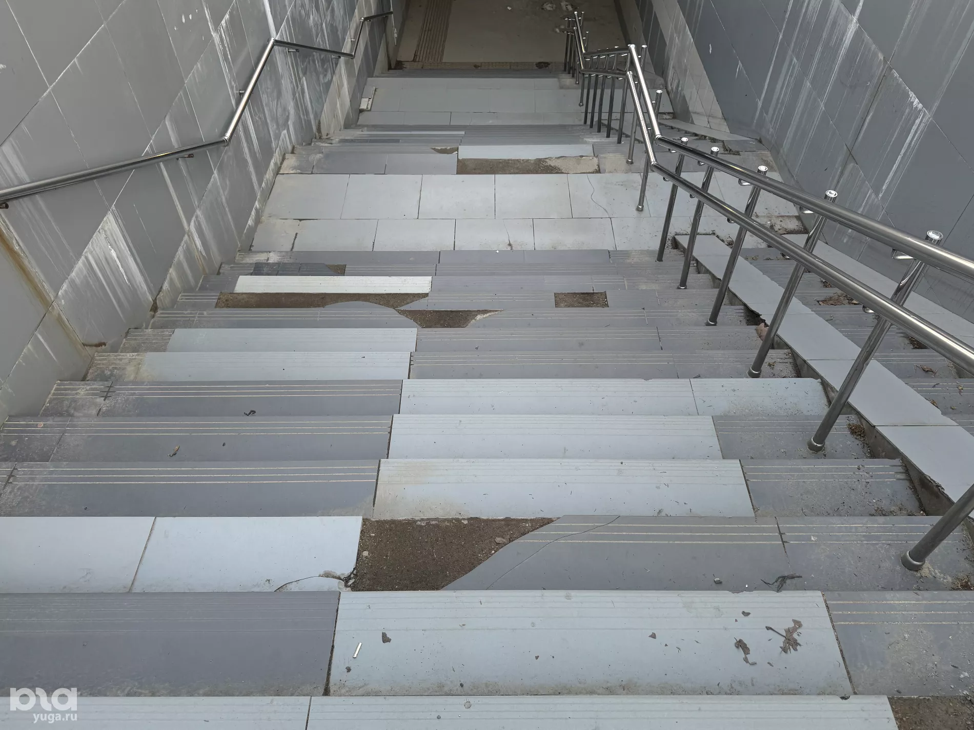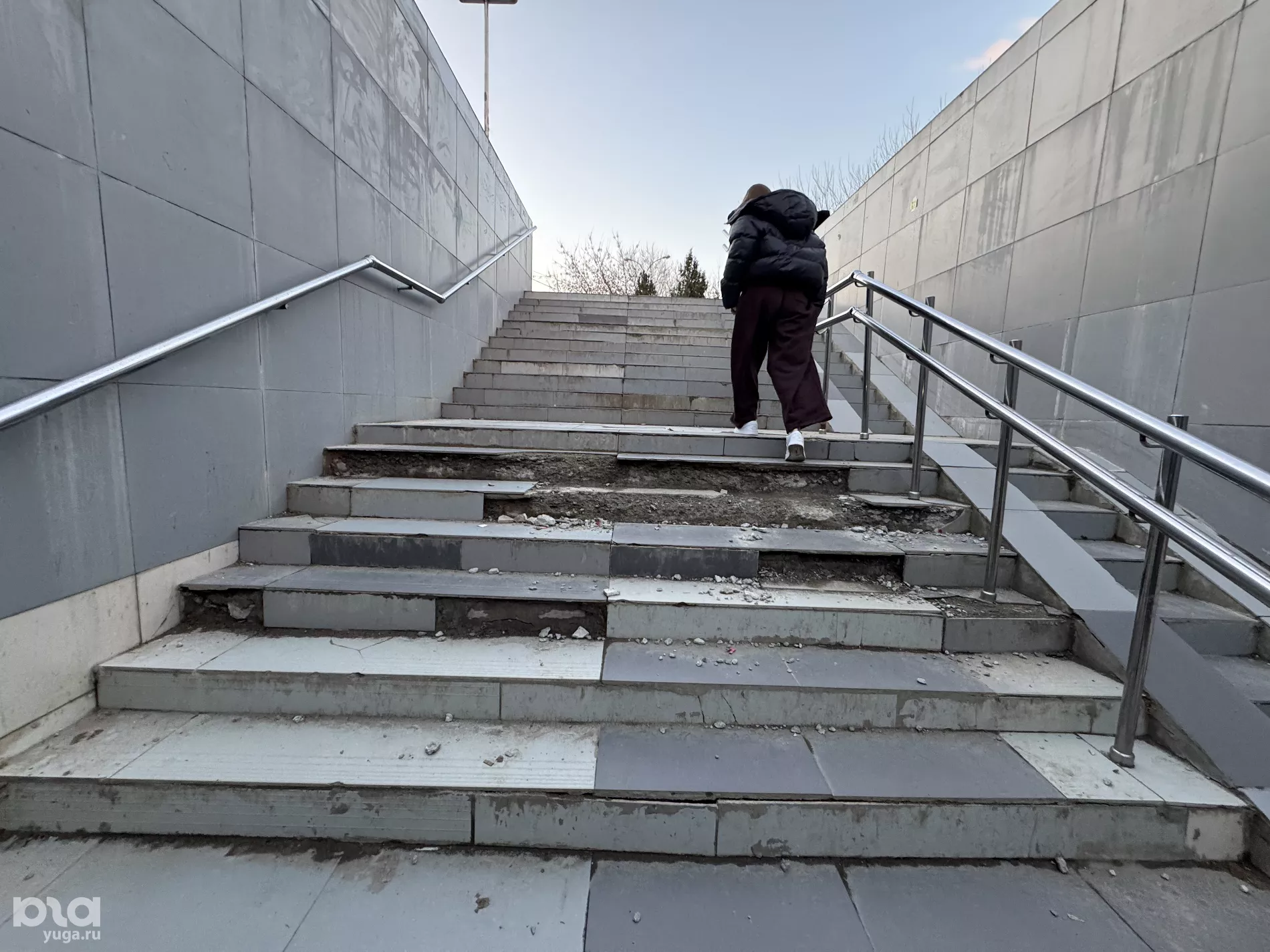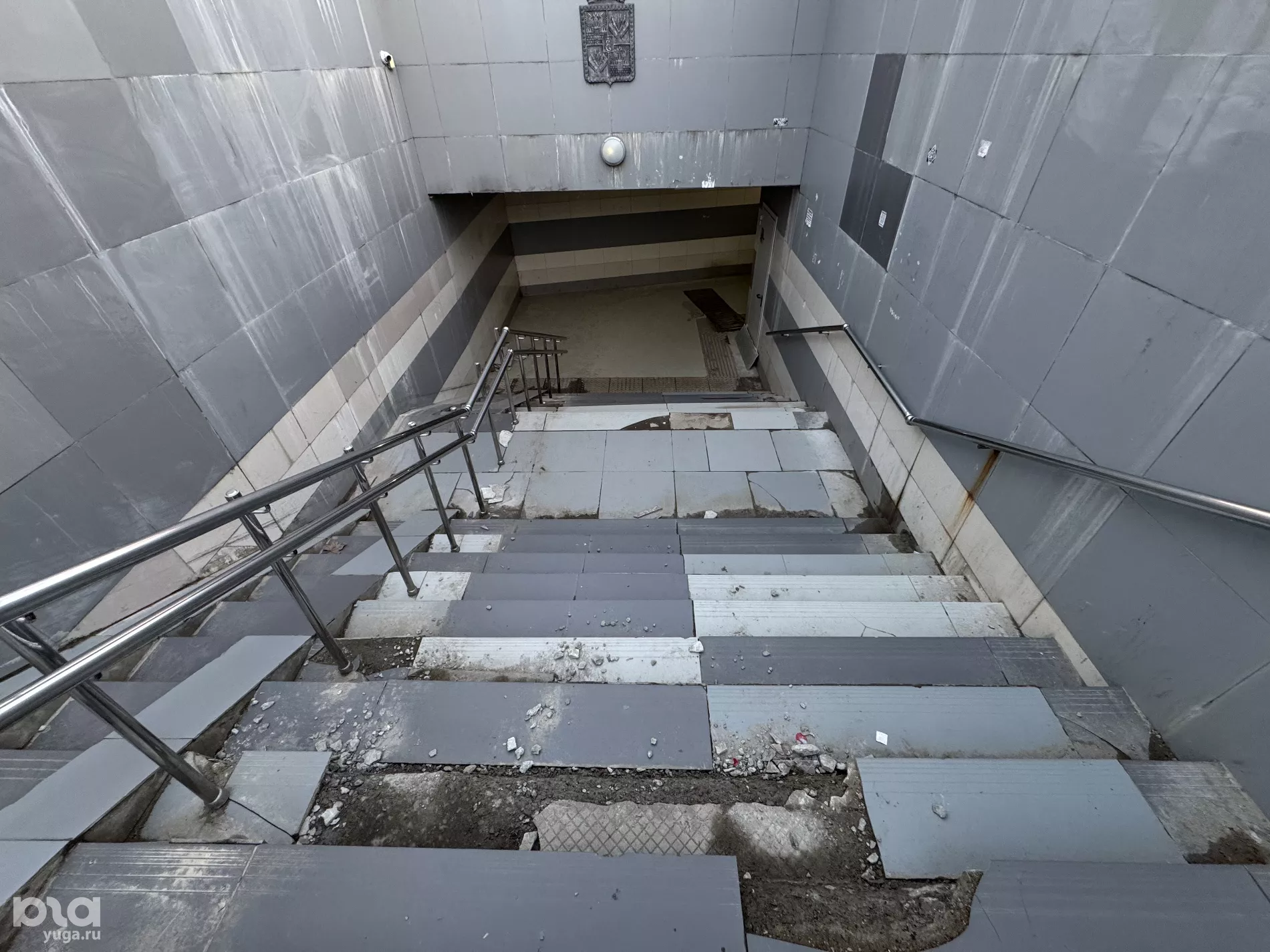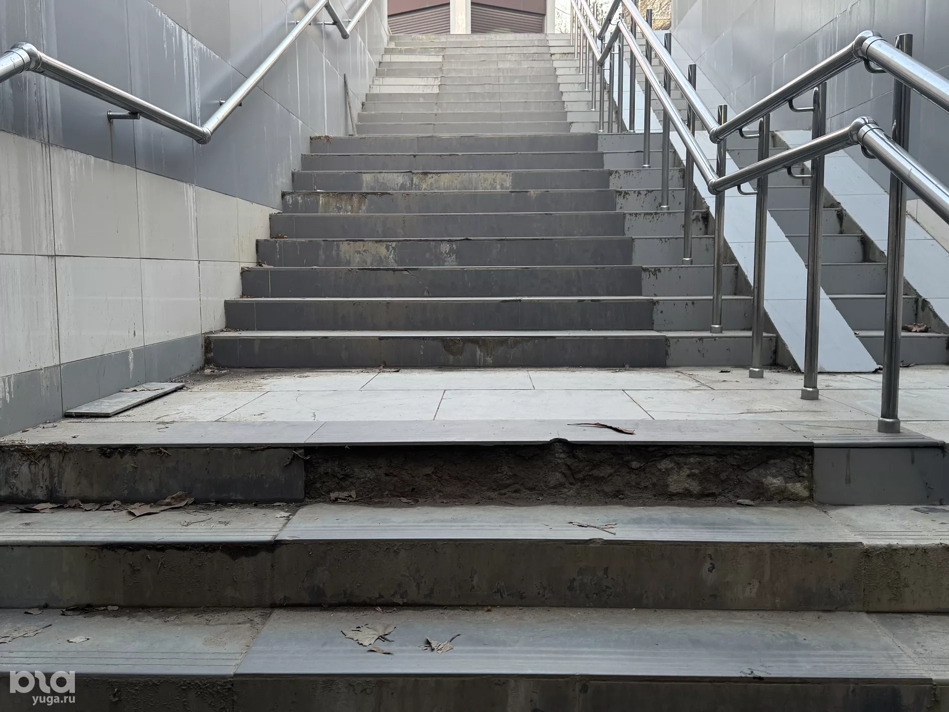 Редактор Юга.ру проверила, как выглядит подземный переход, и убедилась, что он действительно в плохом состоянии — ступени кривые, многие плитки разбиты или вовсе отсутствуют, а стены покрыты разводами.