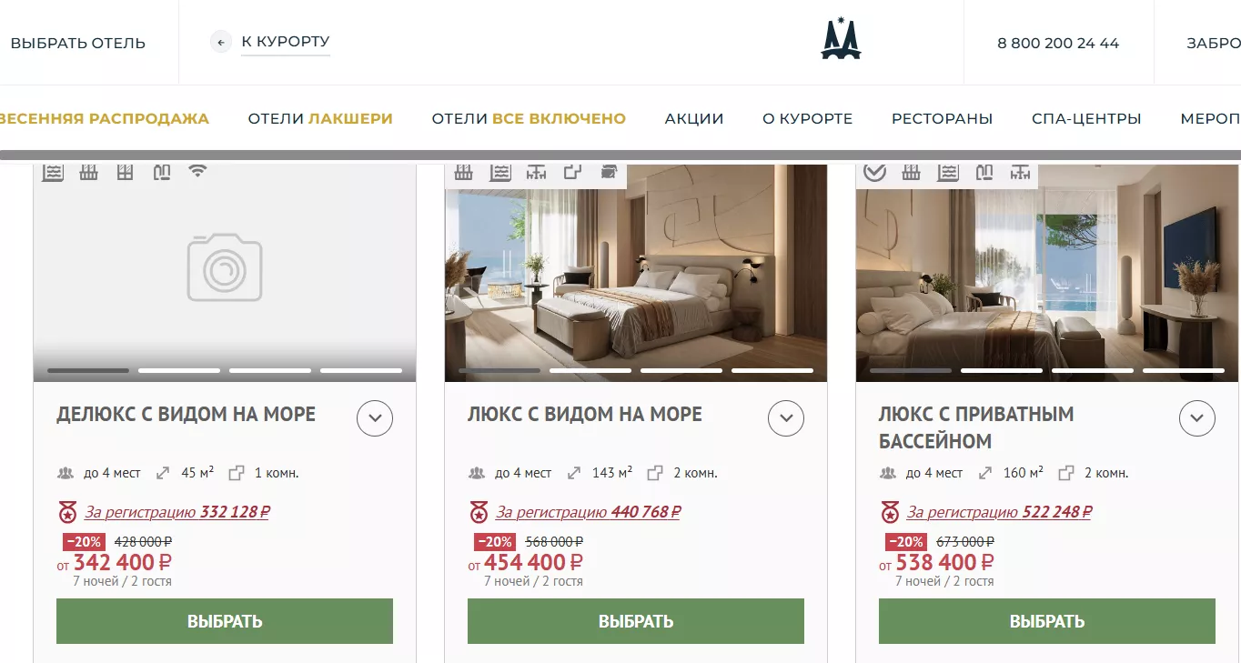 Юга.ру проверили эту информацию. Проживание в указанном отеле с 5 по 12 июня обойдется минимум в 342 тыс. рублей. За эти деньги гости будут жить в однокомнатном люксе площадью 45 кв. метров с видом на море.