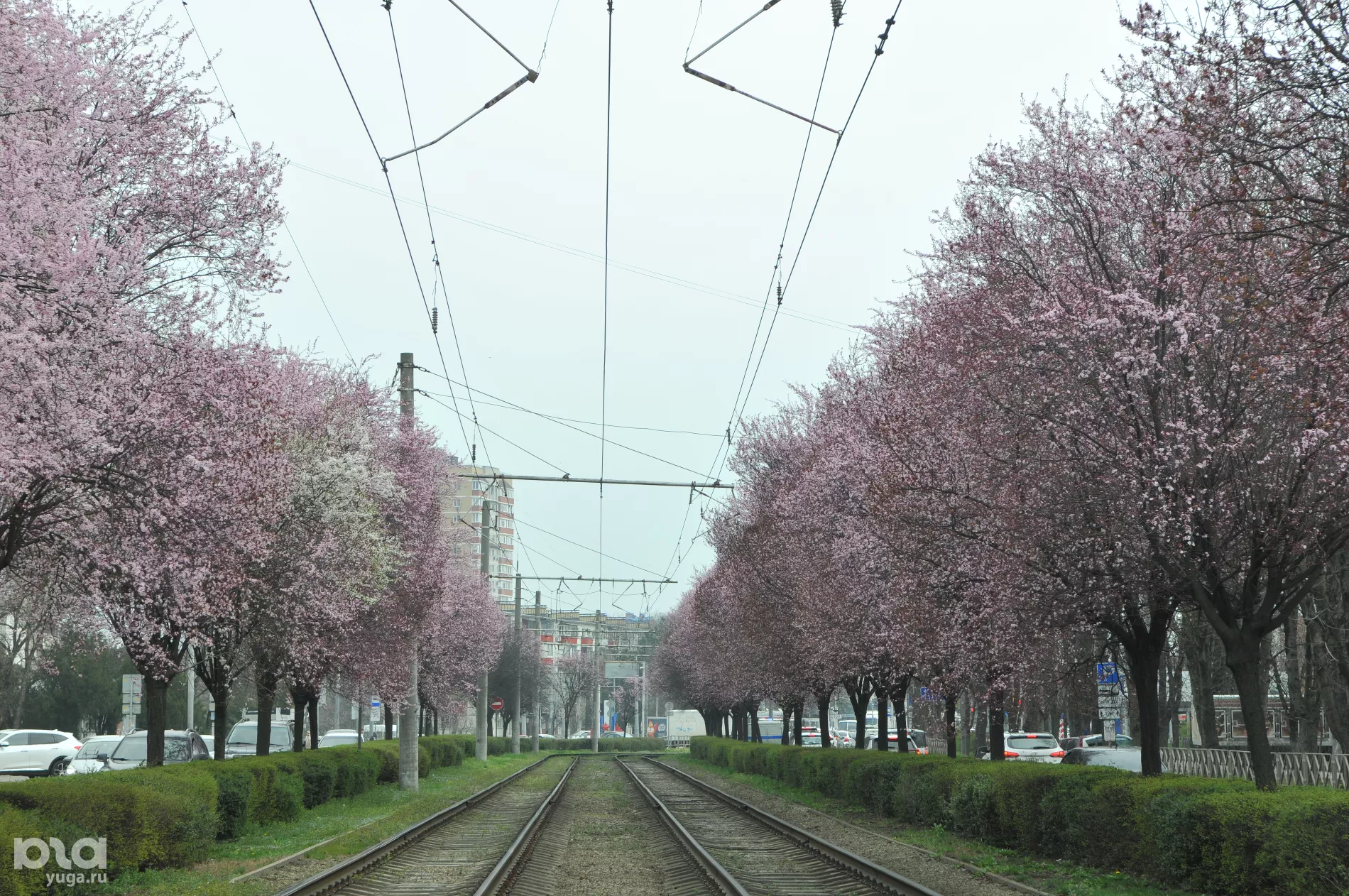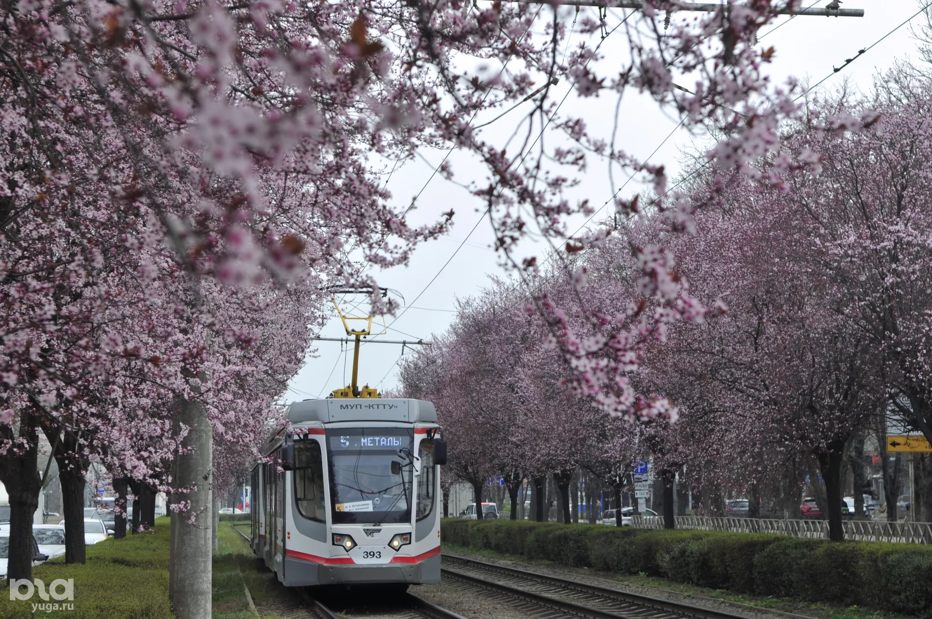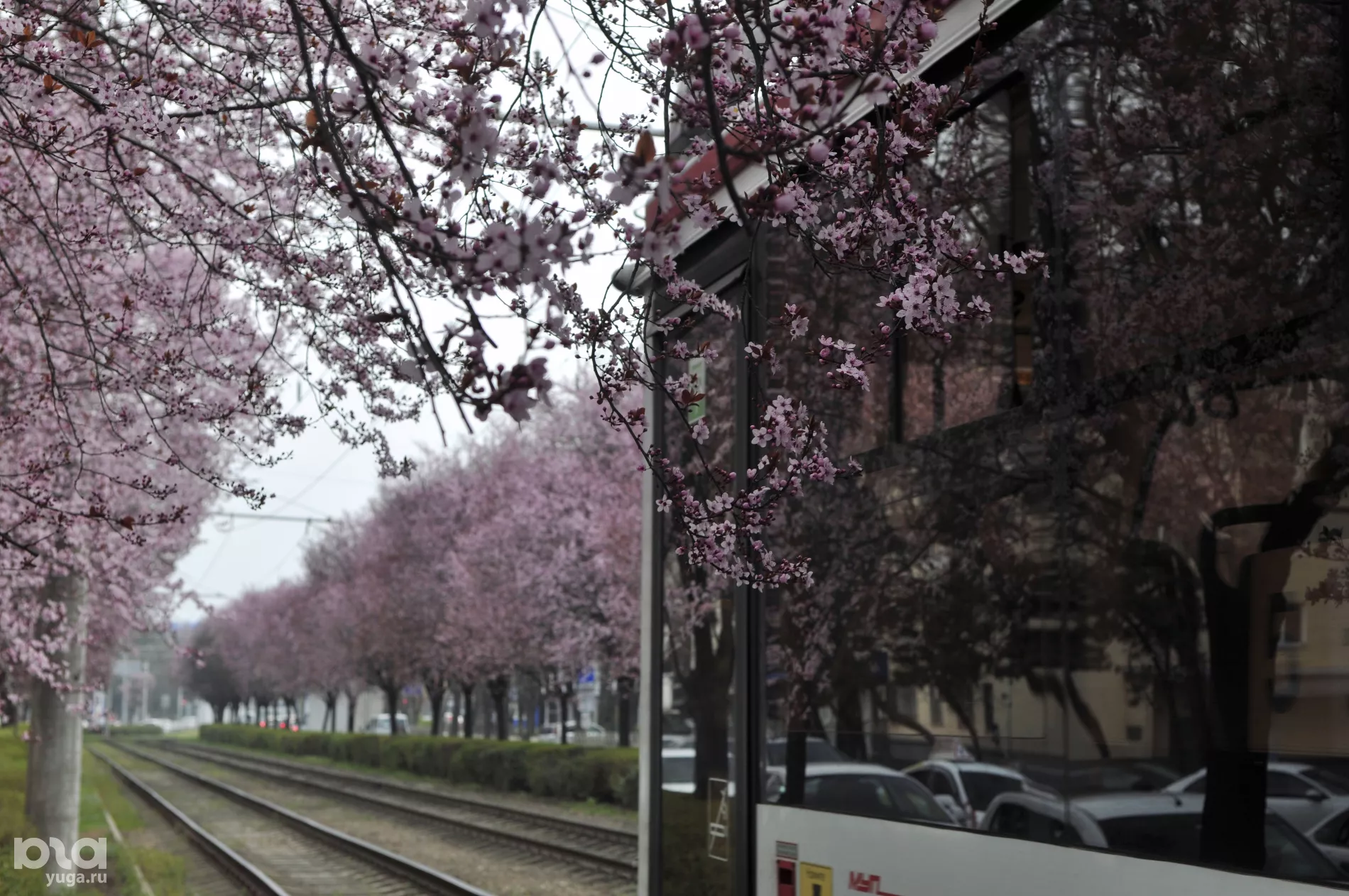 Сакура у трамвайных рельсов: на улице Ставропольской в Краснодаре расцвели сливы «писсарди»