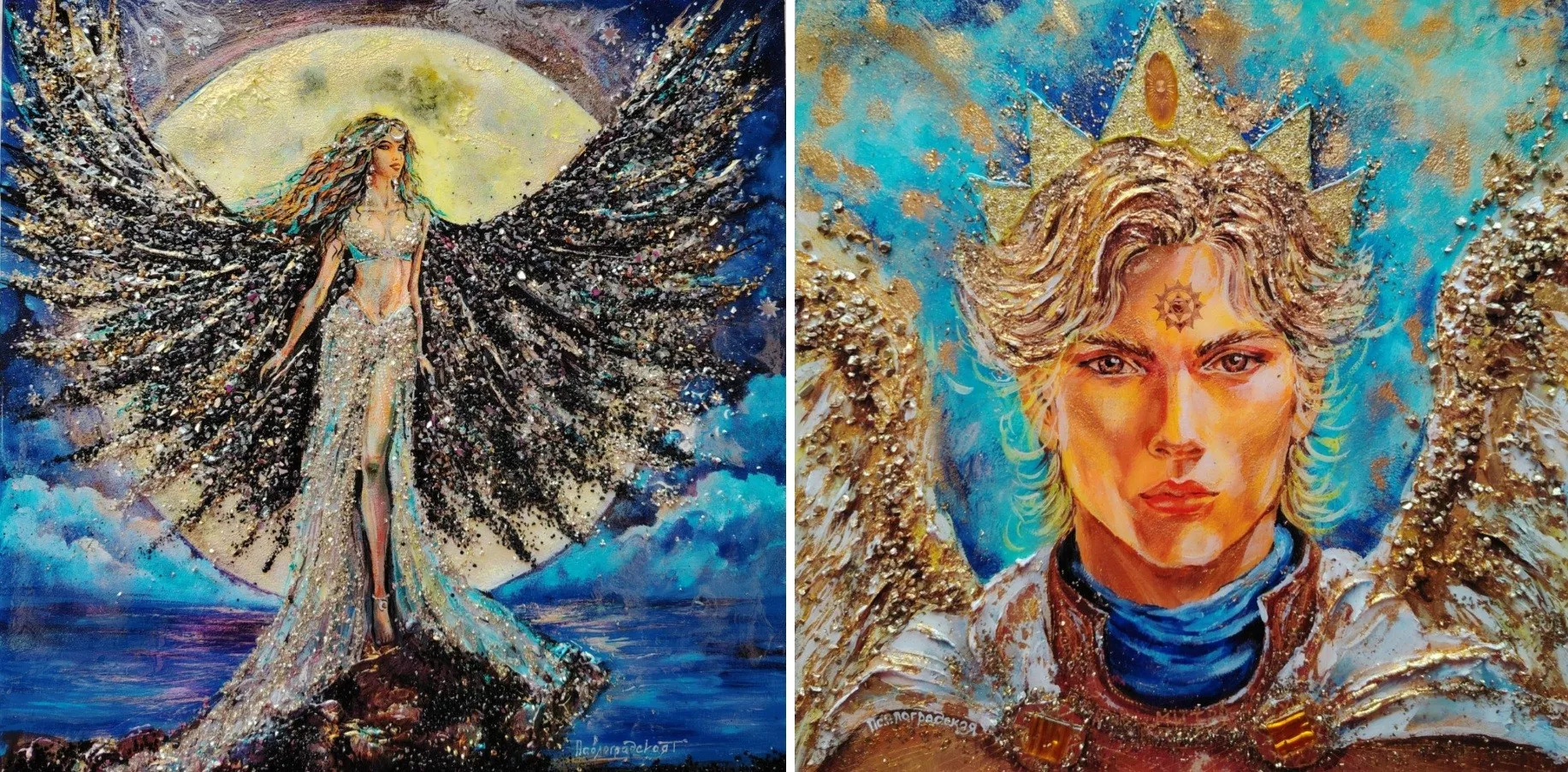 По словам автора, идеи будущих картин приходят к ней во снах. Эти образы в итоге обретают материальную форму в смешанной технике. Павлоградская создает многослойные произведения, соединяя строгую геометрию, текучесть эпоксидной смолы, сияние сусального золота и фрагменты мозаики.