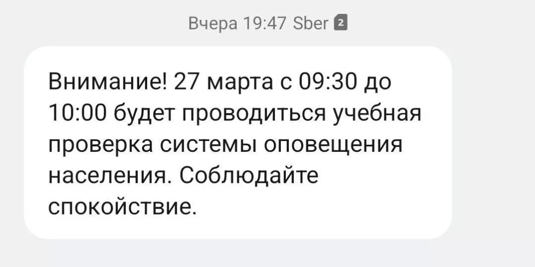 Вечером 26 марта жители Краснодара сообщили, что получили СМС-рассылку от РСЧС. В тексте было сказано, что в пятницу, 27 марта, с 9:30 до 10:00 в городе пройдет проверка систем оповещения. При этом официально власти о запуске сирен не сообщали.