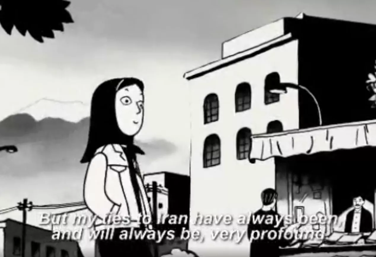 Мультфильм черно-белый, стилизованный под рисунки комикса. Главную героиню зовут Маржан — это сама режиссерка в детстве и юности.