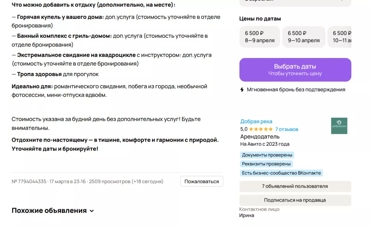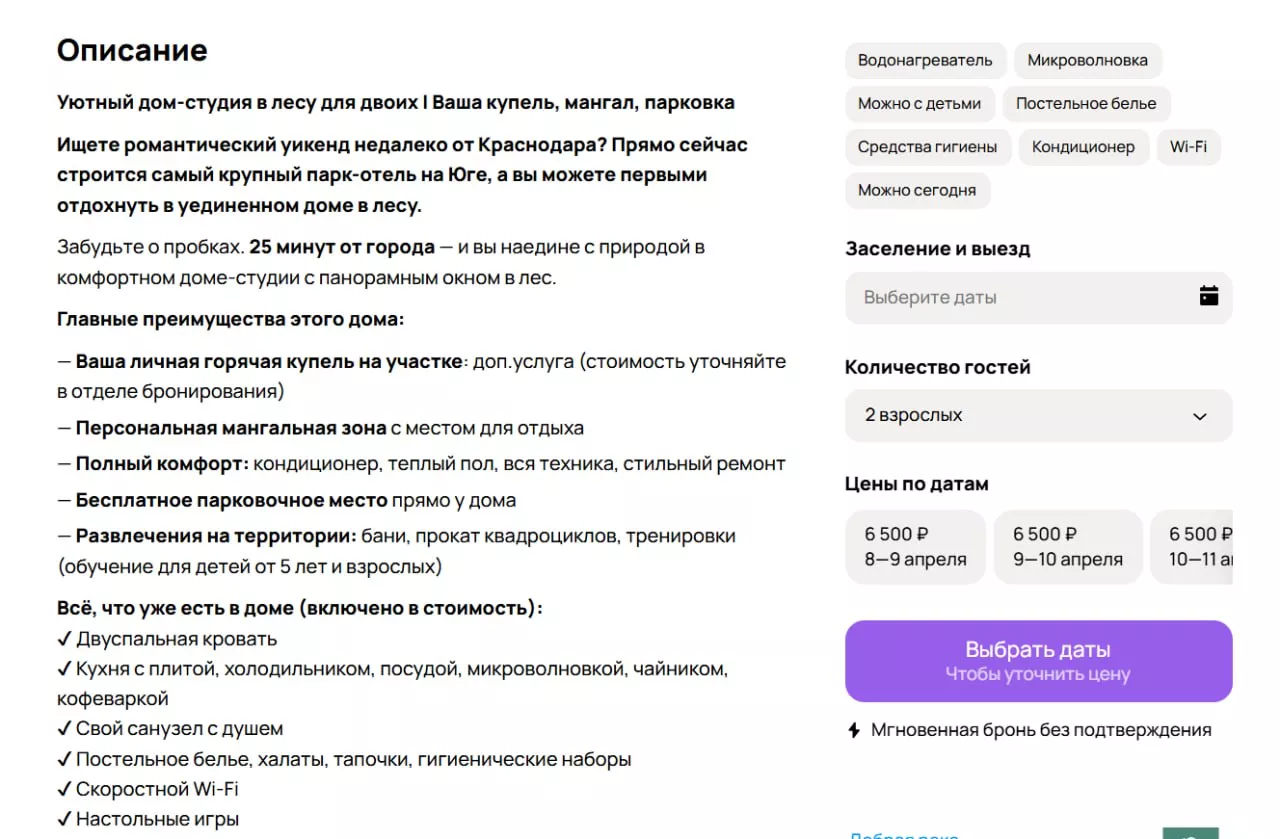 8 апреля активистка Яна Антонова рассказала Юга.ру, что на популярном сайте объявлений появилась публикация с предложением арендовать дом, расположенный на «Большом острове» Краснодара. Он имеет статус особо охраняемой природной территории (ООПТ) местного значения. Там запрещена деятельность, нарушающая природный ландшафт и экологическую ценность. Кроме того, на ООПТ нельзя строить объекты, не связанные с охраной территории.