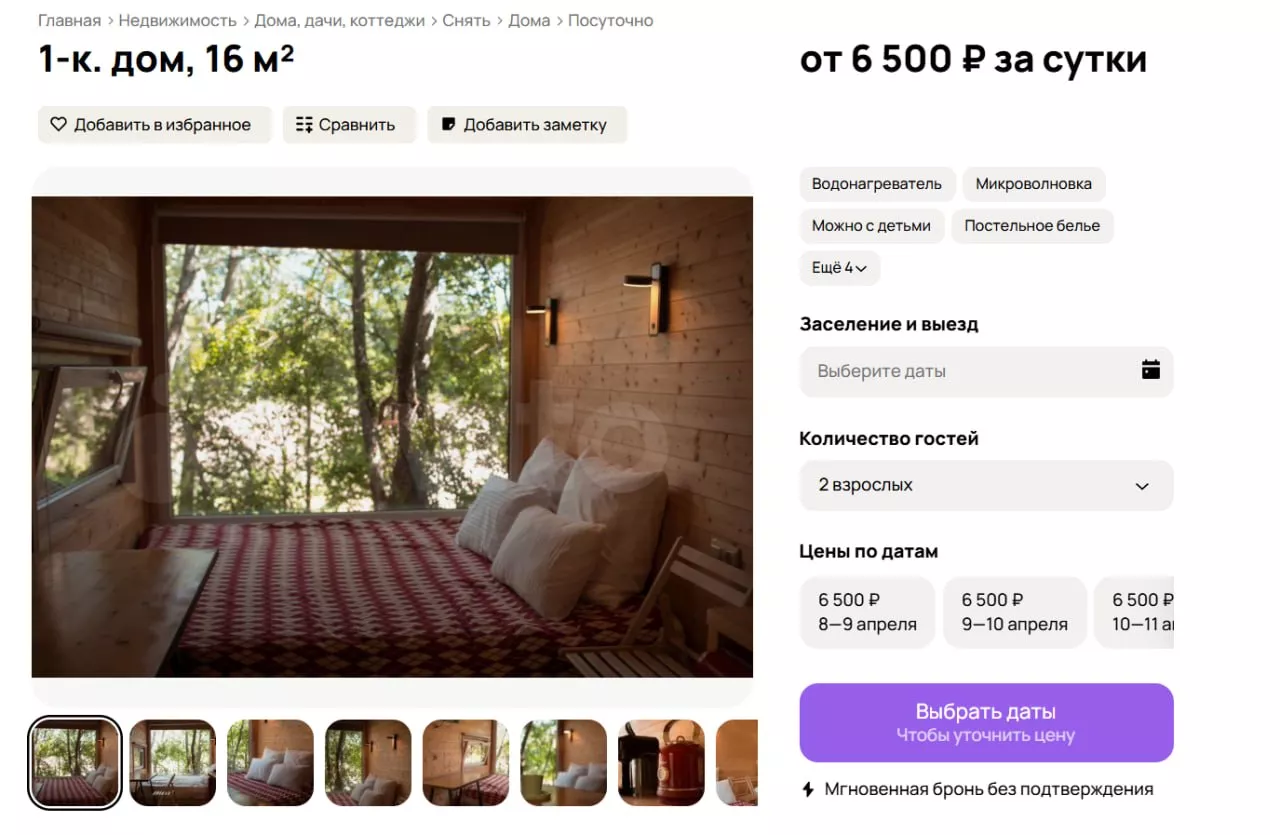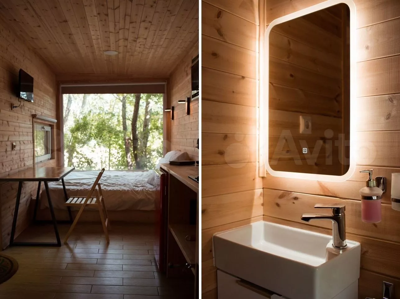В помещении одна комната площадью 16 кв. метров. Есть кондиционер, холодильник, плита, микроволновка, телевизор и фен. Предусмотрен Wi-Fi. Кроме того, в объявлении говорится, что можно воспользоваться баней, сауной, бассейном, беседкой и даже арендовать квадроцикл. Сутки обойдутся в 6,5 тыс. рублей.