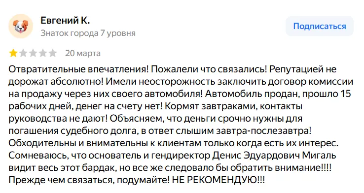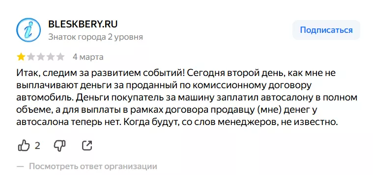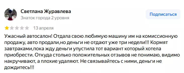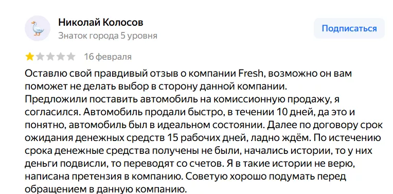 Роман добавил, что, по отзывам в сети, данная ситуация носит массовый характер по всем филиалам компании Fresh. Юга.ру проанализировали комментарии посетителей автосалона на Покрышкина, 13 на «Яндекс. Карты». Многие люди пишут, что Fresh им тоже не выплачивает деньги за авто после продажи.
