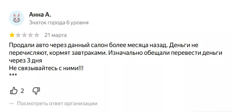24 марта менеджер автосалона сообщил, что автомобиль удалось продать — деньги за него поступили на счет компании. По договору мужчина должен был получить 2,5 млн рублей за свою машину в течение 15 рабочих дней. Этот срок уже прошел — деньги ему не перечислили.