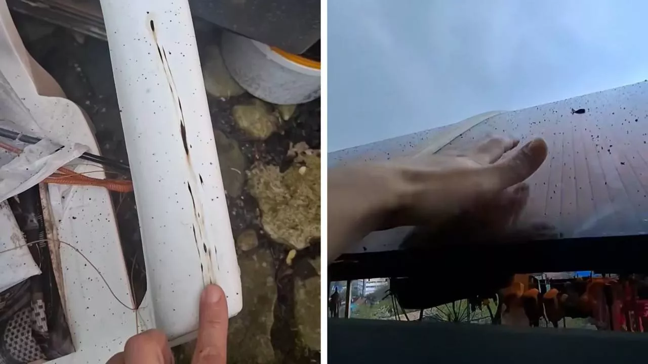 Местный житель поделился видео, на котором видны следы нефтяного дождя. Например, капли хорошо заметны на белом пластиковом стуле, стоявшем во дворе у автора ролика. Также мужчина показал навес, покрытый маслянистым налетом.