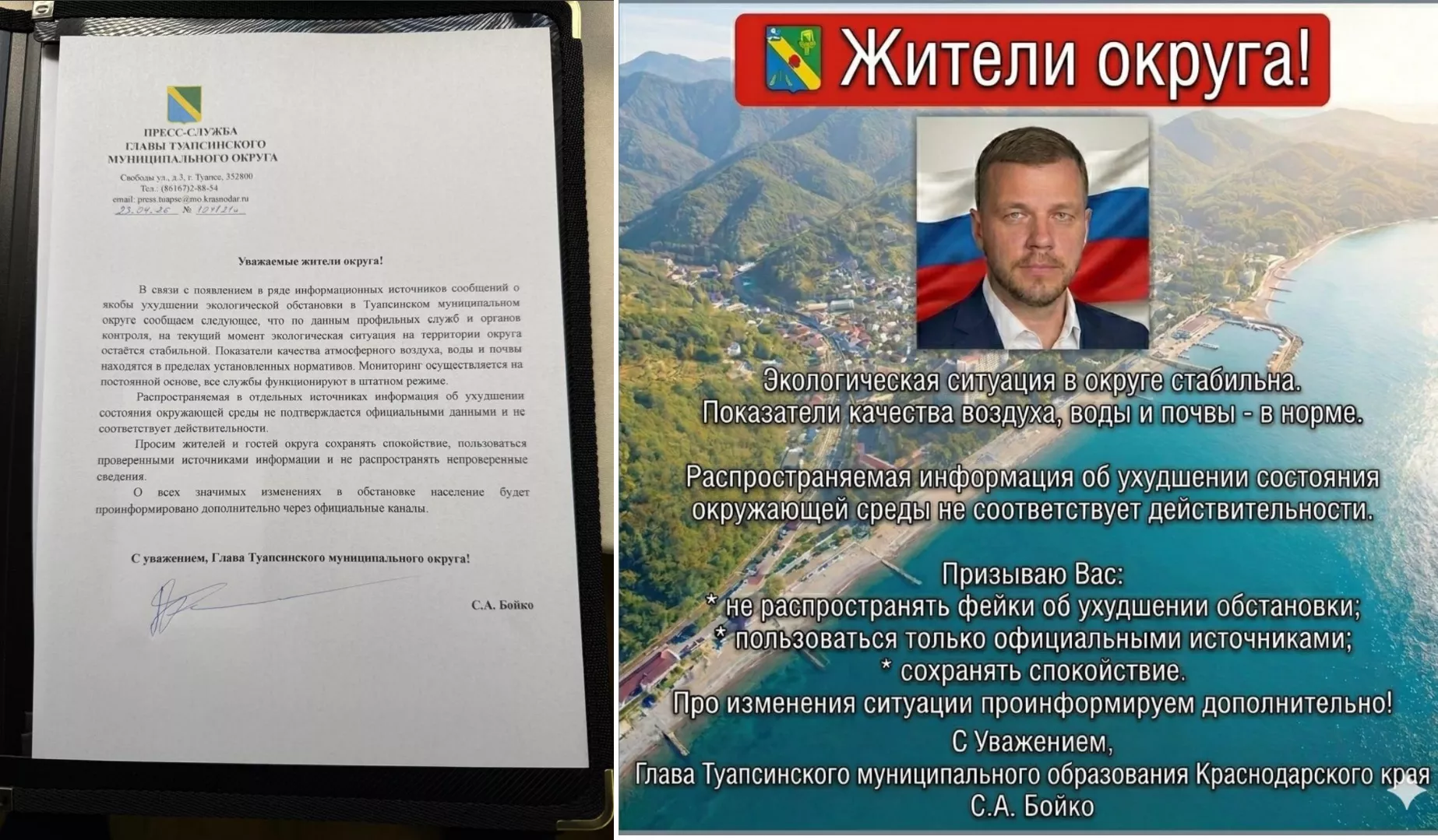 Кроме того, портал Юга.ру получил письмо, якобы подписанное Сергеем Бойко. В документе чиновник сообщает, что экологическая ситуация в округе остается стабильной, и просит жителей не распространять непроверенные свежения.