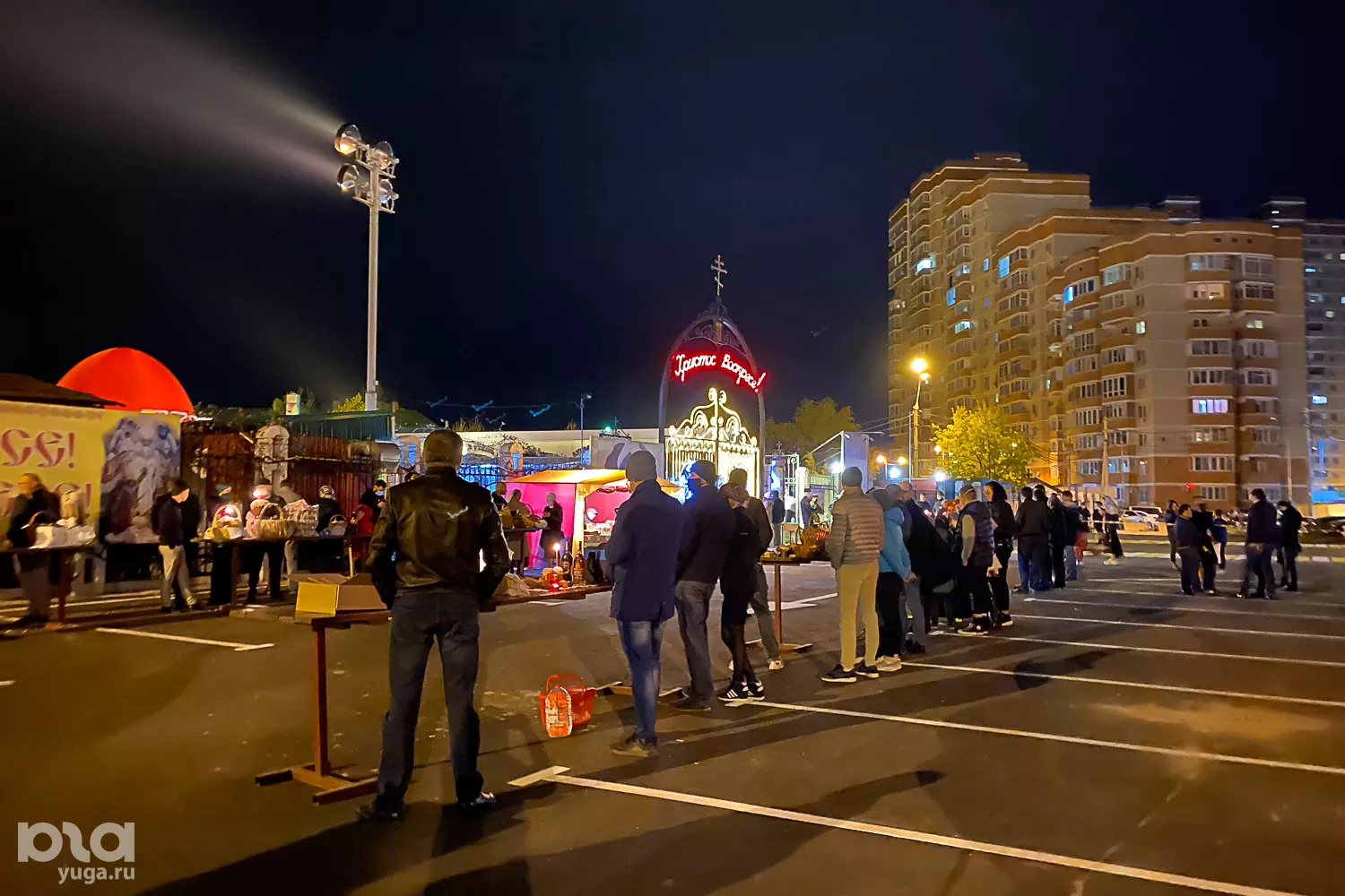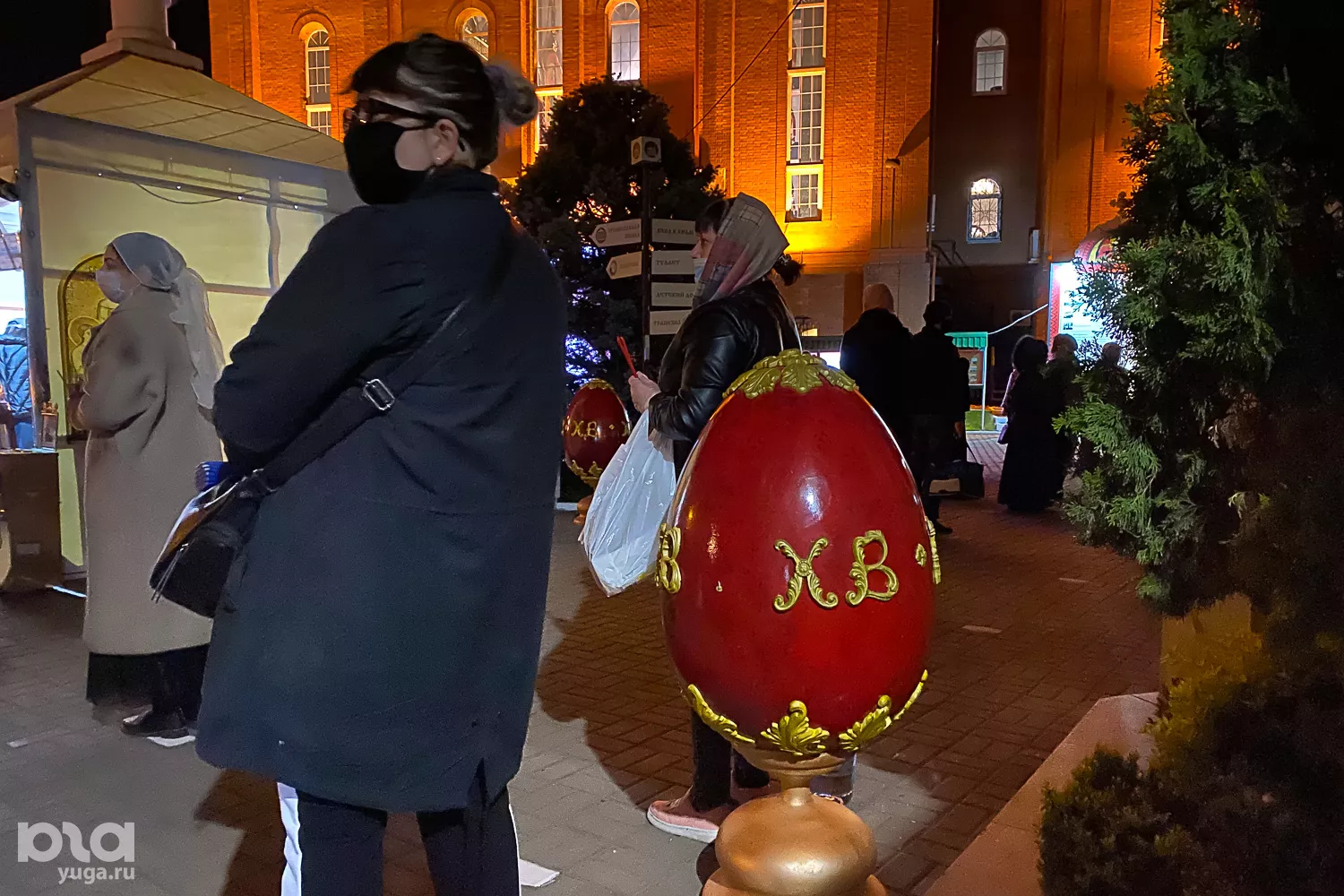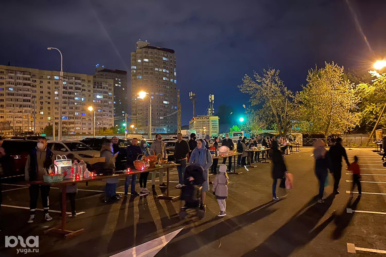 На площадке за пределами храма установили столы для людей, которых либо не пустили внутрь, либо которые сами решили не заходить и ждали освящения куличей и яиц.