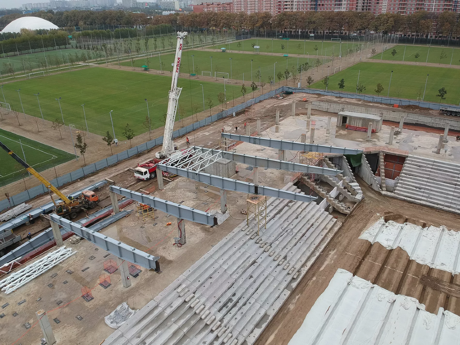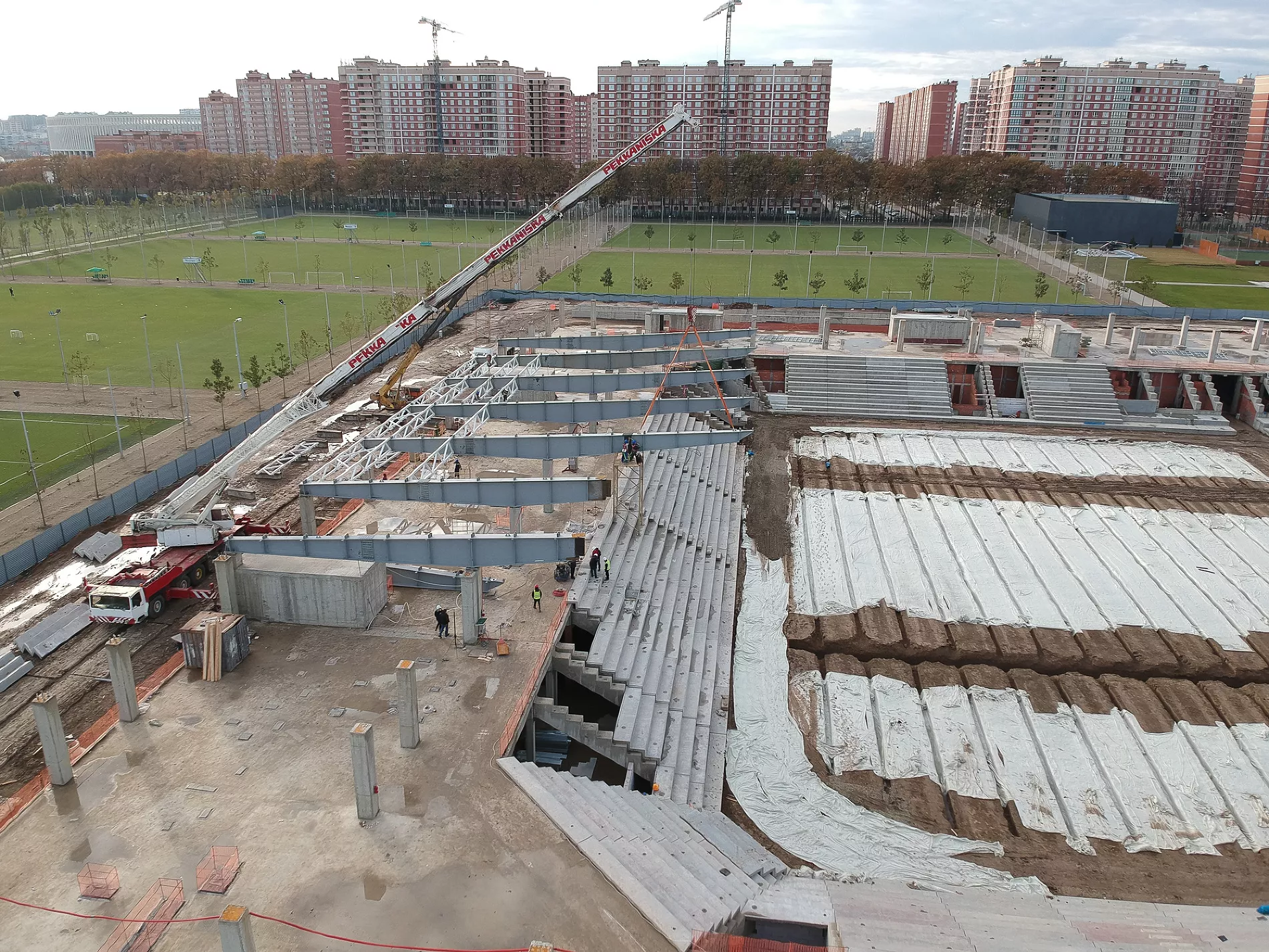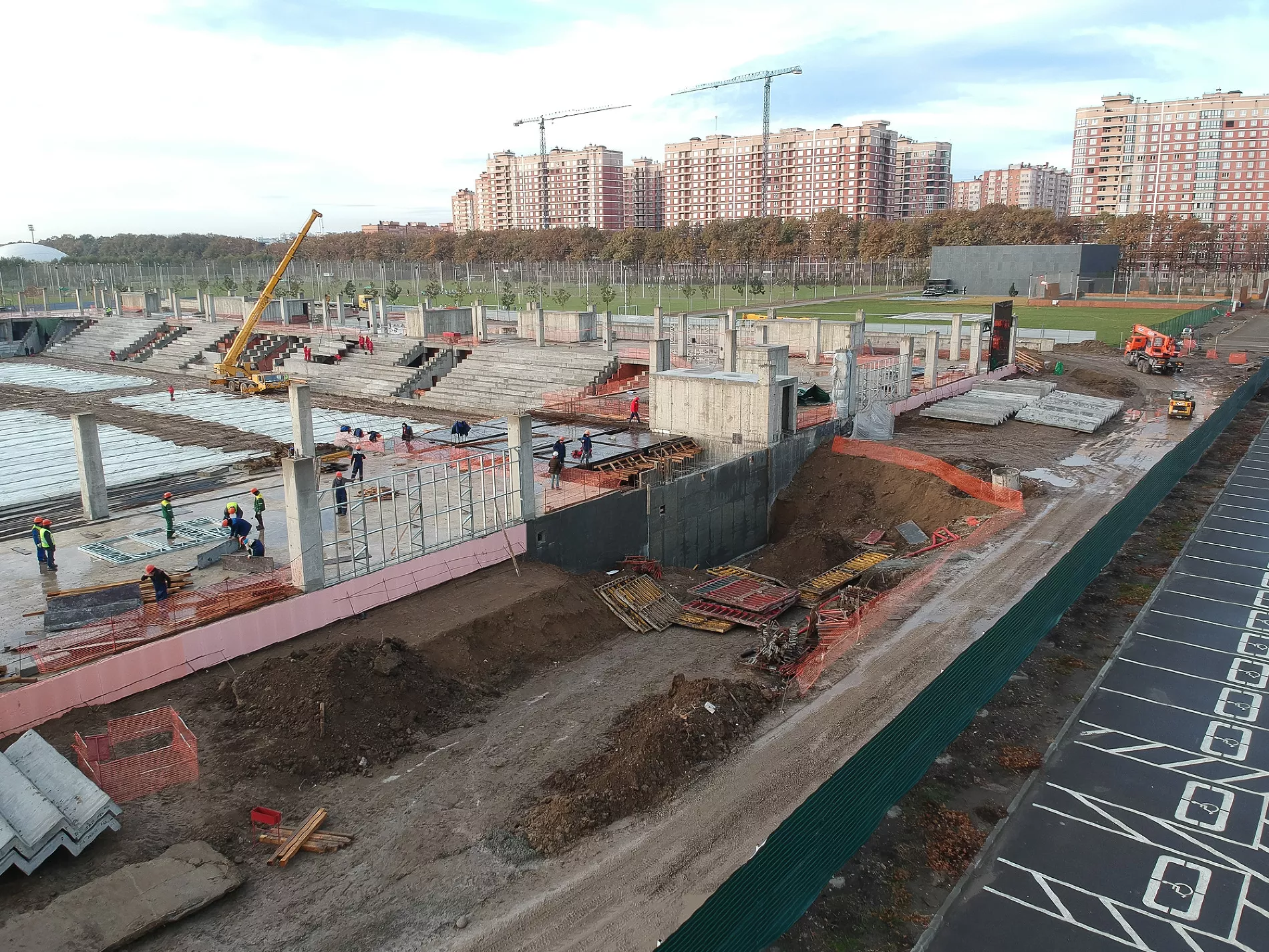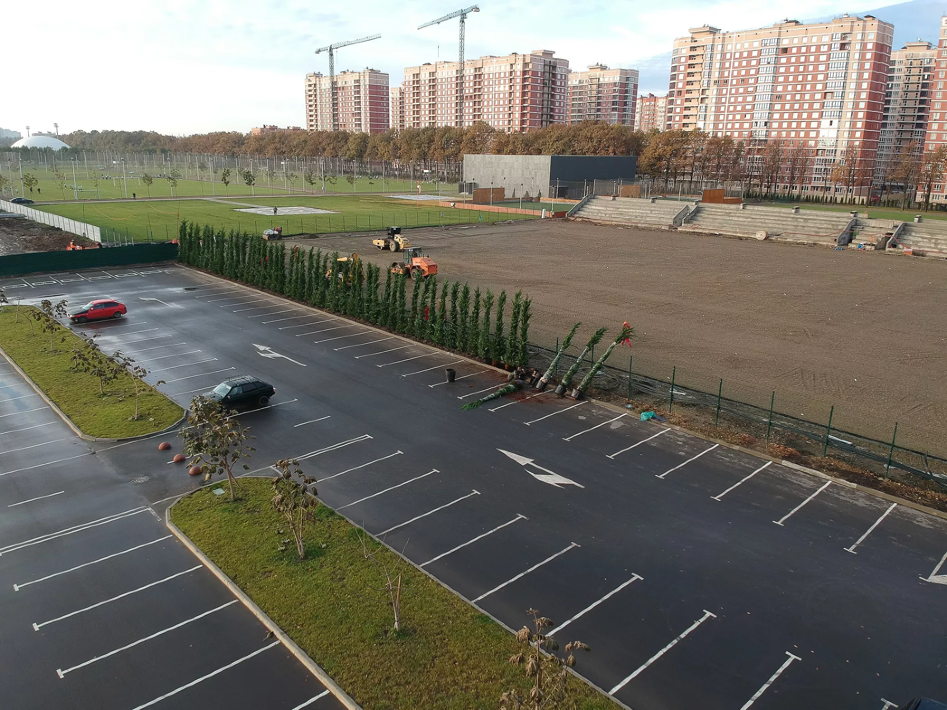 «На прошлой неделе, например, пошел прогресс по крыше. Видим, какая она будет, какой козырек, стало понятно, какой стадион будет по высоте. Уже почти готовы поля у третьего стадиона. Плюс, судя по плану, через дорогу от объекта ведутся работы по строительству еще одной парковки», — рассказал Евгений Таранжин.