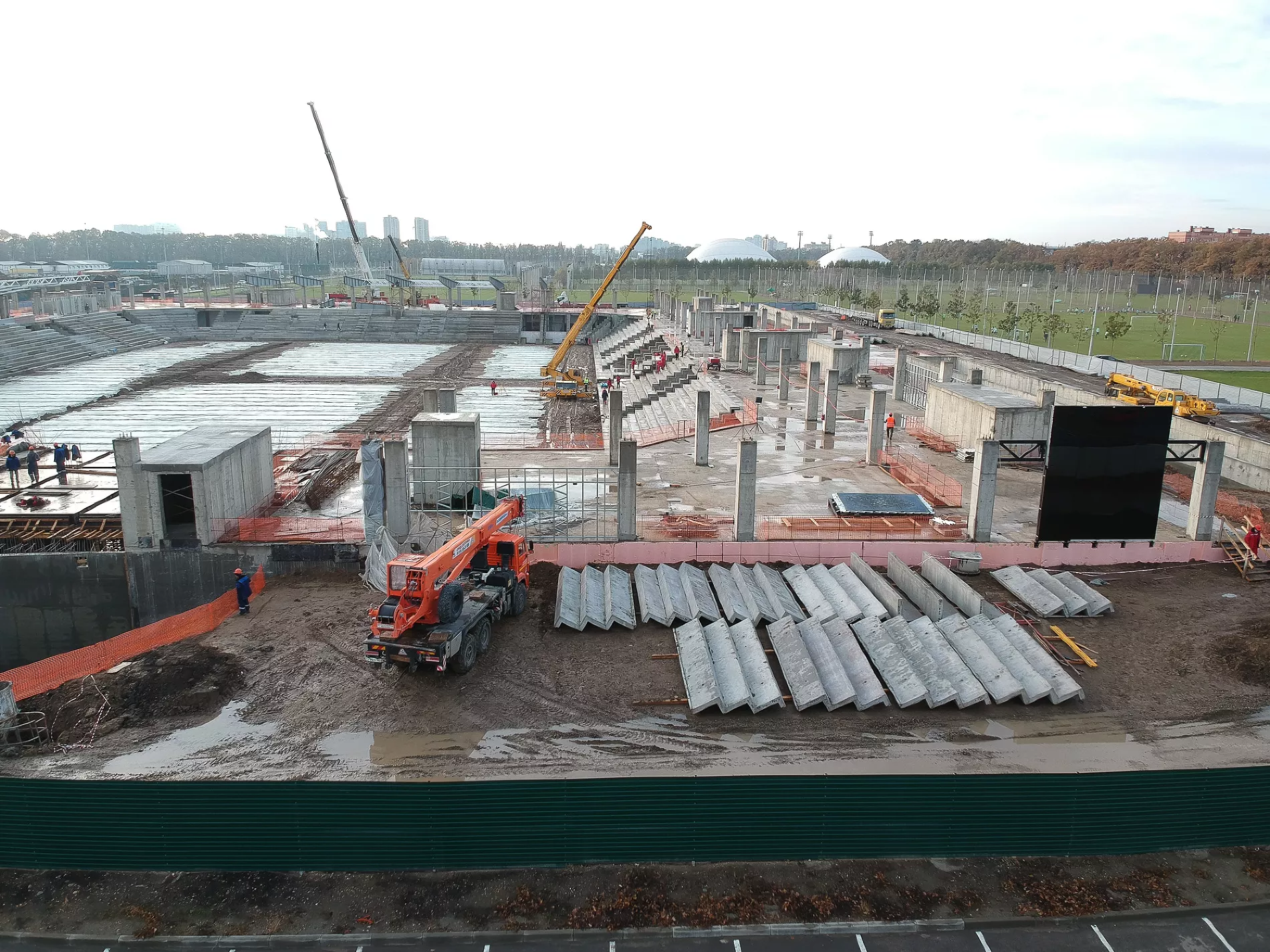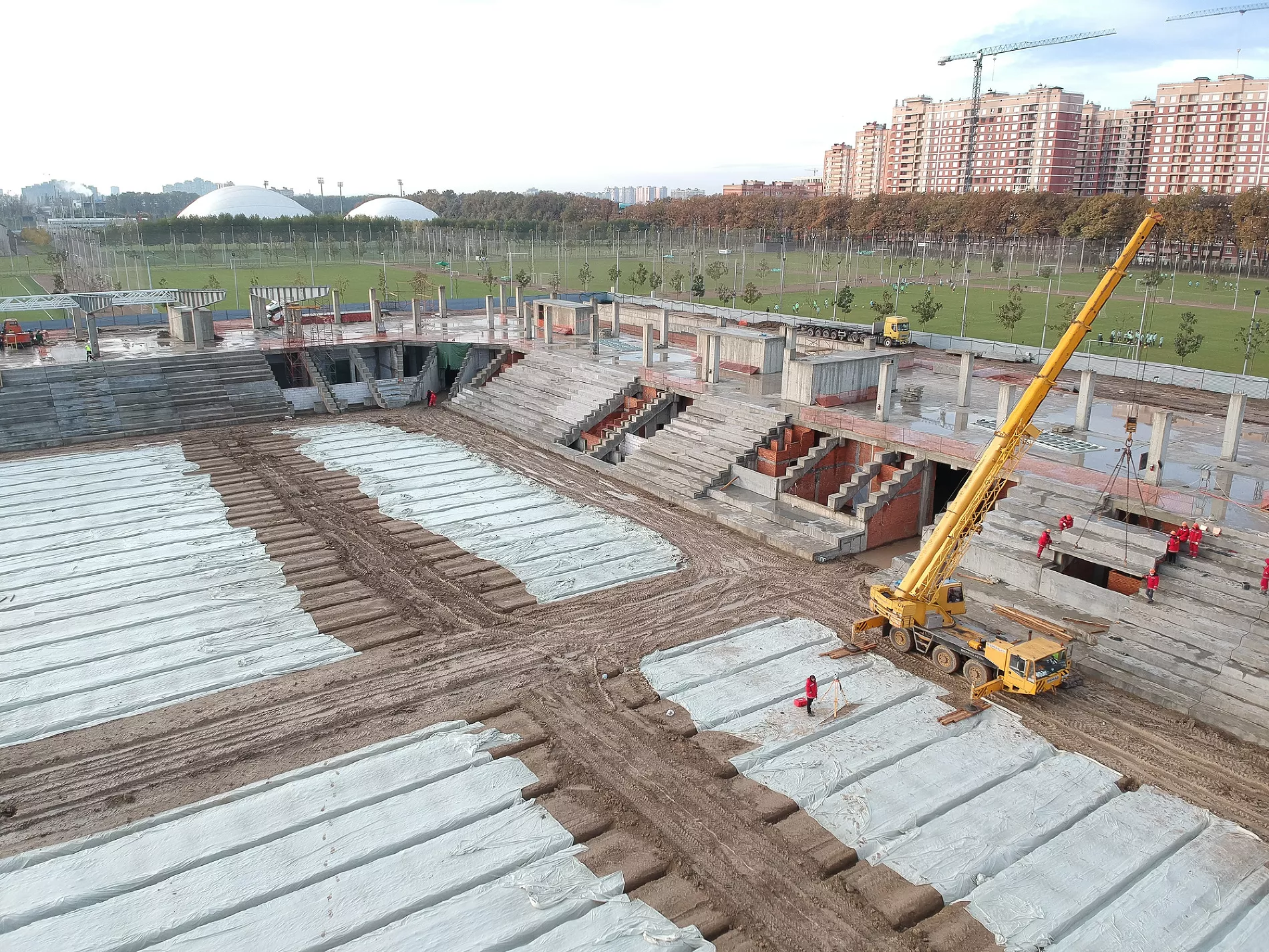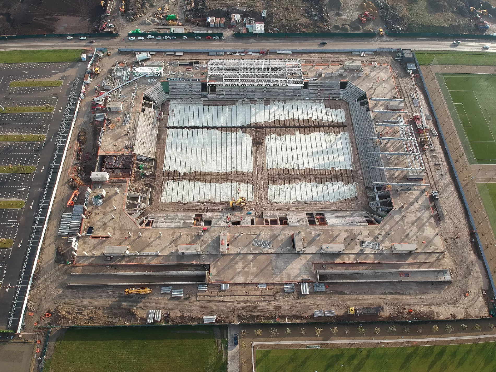 «На прошлой неделе, например, пошел прогресс по крыше. Видим, какая она будет, какой козырек, стало понятно, какой стадион будет по высоте. Уже почти готовы поля у третьего стадиона. Плюс, судя по плану, через дорогу от объекта ведутся работы по строительству еще одной парковки», — рассказал Евгений Таранжин.
