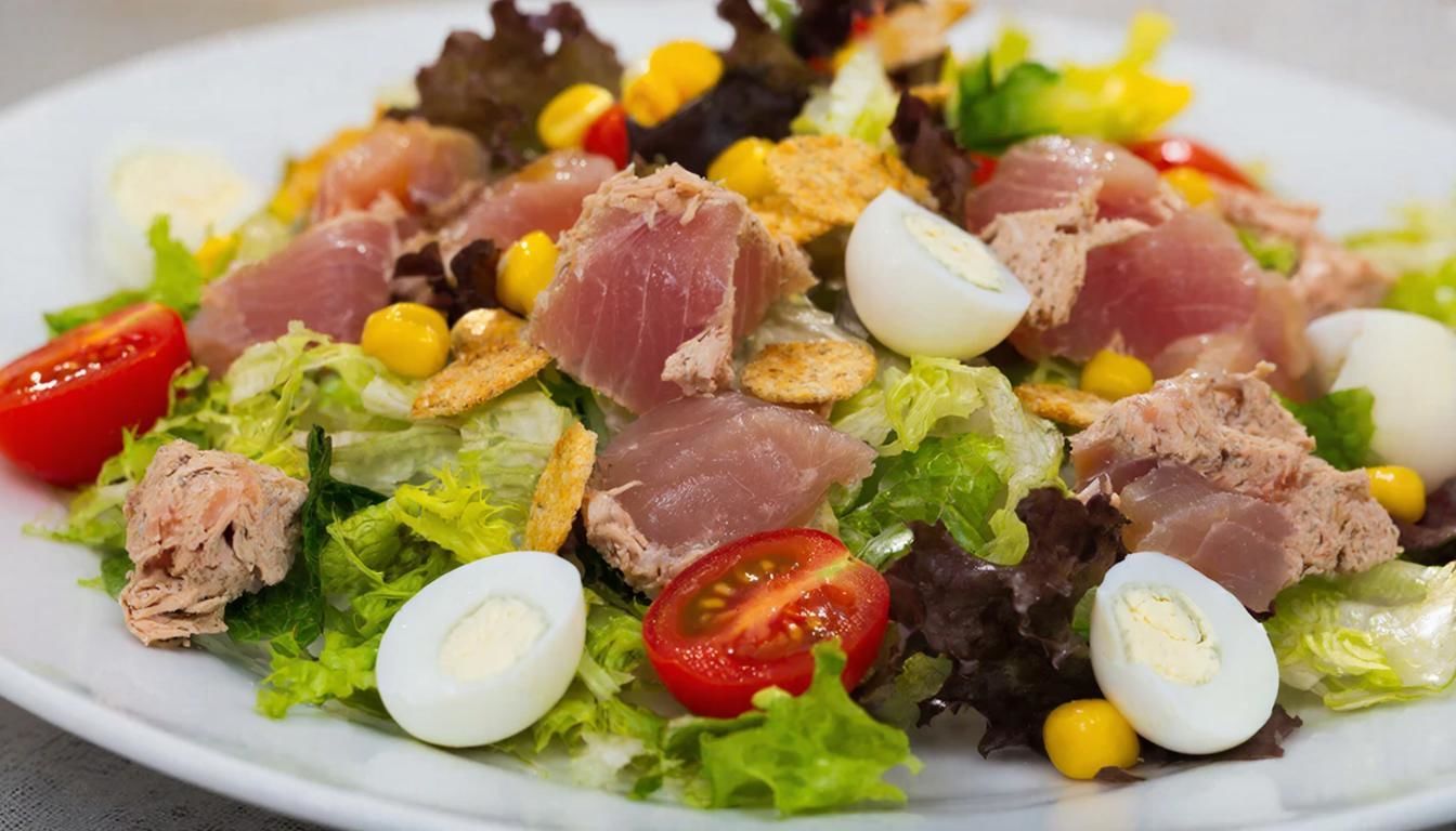 Этот салат сочетает в себе несколько ярких вкусов и текстур — копчёное мясо, хрустящую капусту, сочные помидоры с чесноком и нежную яично-сырную прослойку.