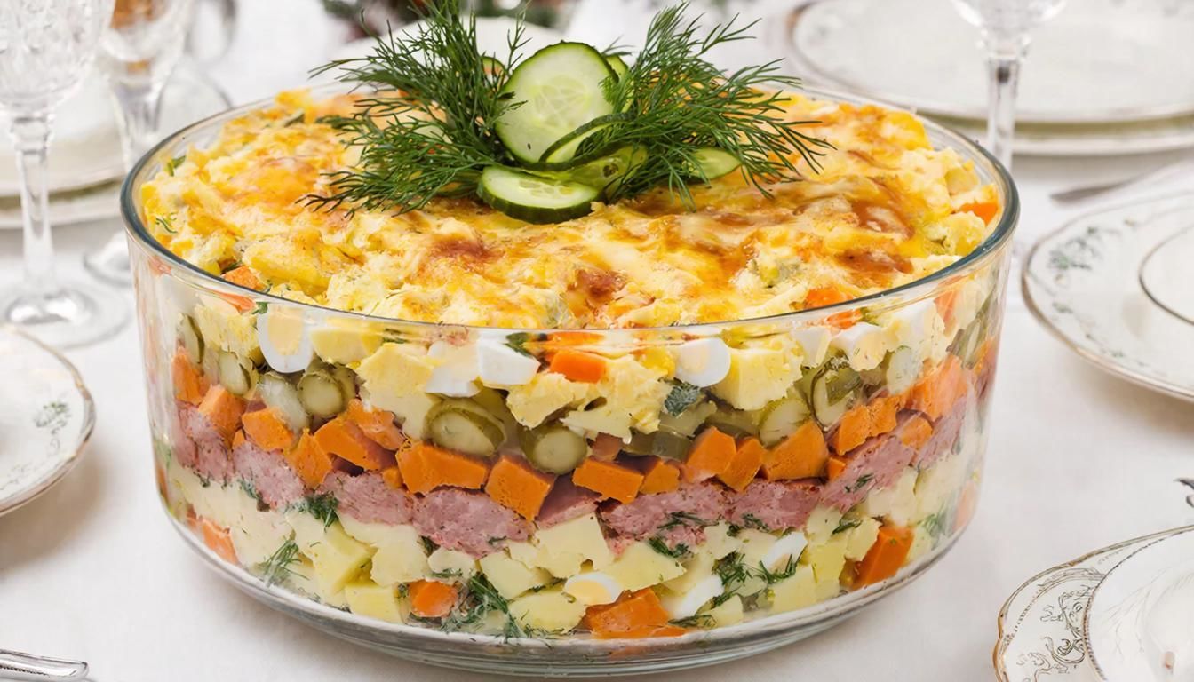 Салат «Президентский», популярный в 1990-х годах, представляет собой многослойное блюдо, сочетающее отварные, обжаренные и свежие ингредиенты.